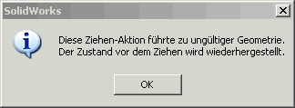 Hatte zwar diese Fehlermeldung noch nie, aber die Aussage, wenn zutreffend, ist doch eindeutig. Durch das Ziehen entsteht eine ungültige Geometrie, welche SWX nicht rechnen kann. Da wird es wohl keinen Schalter geben, da musst du die Geometrie richtig stellen. ------------------ Ich komm ja schon bin schon da Eine Antwort auf diesen Beitrag verfassen (mit Zitat/Zitat des Beitrags) IP |