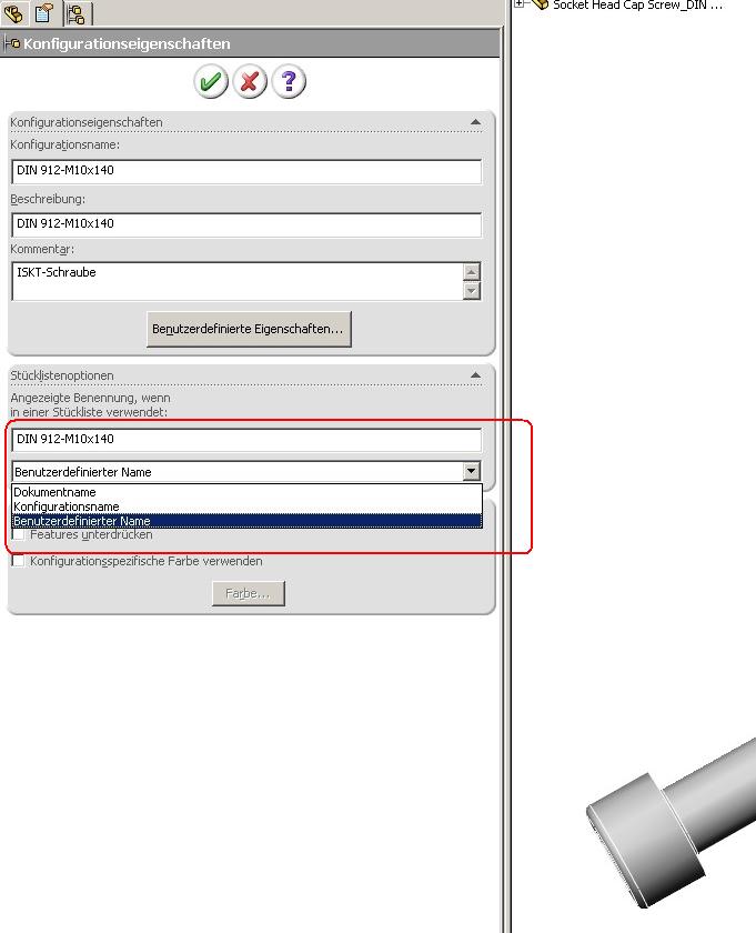 der Configuration.AlternateName tatsächlich leer ist. Bis jetzt bleibt der darin eventuell stehende Text einfach erhalten.Warum die Frage/Welcher Sinn: Für die Toolboxteile haben wir für uns festgelegt, daß in der Stückliste als Benennung der Konfigurationsname eingetragen wird. Mit z.B."Socket Head Cap Screw_DIN" für eine ISKT-Schraube sind unsere Kunden nicht zufrieden. Nun trägt die Toolbox den Konfigurationsname ständig als "Benutzerdefinierten Namen" in die Konfigurationseigenschaften ein. Und deshalb steht der Schalter für die Alternative Benennung eben auf "Benutzerdefiniert" und nicht auf "Konfigurationsname" und in "Configuration.AlternateName" steht was drinnen. Will ich von Hand auf "Konfigurationsname" umstellen, dann muß ich die Benennungseingabe für "Benutzerdefiniert" vollständig löschen/leer machen... Und gut ist´s. Nun soll das aber per Makro über alle unsere Toolboxteile und alle Konfigurationen erfolgen. Bei uns ist es doch passiert, daß nach dem Umbenennen von Konfigurationen in der Stückliste der alte benutzerdefinierte Name erschien und das eigentlich gewollte Teil nicht. Also: Wie schaffe ich es Per API: Configuration.AlternateName = "" auszuführen? Viele Grüße! Thomas