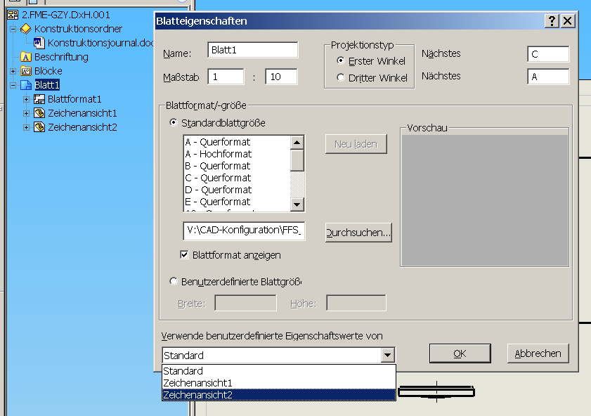 Du hast auf Blatt 1 eine Ansicht der Baugruppe (=Blechteil + eingepresste Muttern) Du hast auf Blatt 2 eine Ansicht der Abwicklung des Blechteils mit den Meta-Eigenschaften, die das Schriftfeld passend ausfüllen. Du willst auf Blatt 1 die gleichen Daten im Schriftfeld haben wie auf Blatt 2. Tue folgendes: * auf Blatt 1 eine Ansicht (sagen wir, es sei Ansicht 2) der Abwicklung einfügen, ganz so wie auf Blatt 2 * in den Eigenschaften des Blatts festlegen, dass die benutzerdefinierten Eigenschaften aus dem Modell bezogen werden sollen, das der neu eingefügten Ansicht 2 zugrundeliegt (s. Screenshots) * Ansicht 2 ausblenden. Nicht schön, aber funktional. ------------------ Tue was Du tust. Eine Antwort auf diesen Beitrag verfassen (mit Zitat/Zitat des Beitrags) IP |