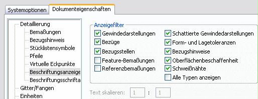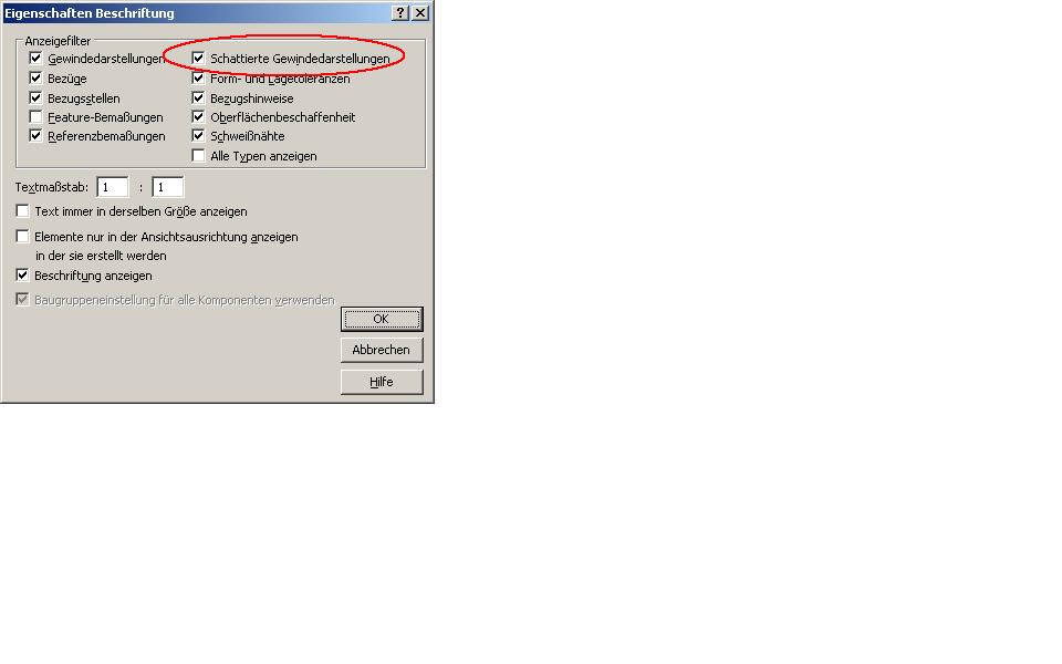 Hallo Stefan, vielen Dank für das Licht im Dunkeln!!! Ja, als ich mir dann nochmal den Schalter für die Ebenensichtbarkeit in Erinnerung gerufen habe, machte das ganze dann auch einen Sinn. Bei den Beschriftungen verhält sich das ganze natürlich auch so. Wir haben vor ca. 20 Monaten von 2D auf SWX umgestellt; als ich die Administration angefangen habe, hielten sich meine Kenntnisse über SWX sehr in Grenzen. Daher hab ich mir über diese Einstellung in den Vorlagen auch keine großen Gedanken gemacht; die Textur war da, bis heute funktionierte das auch (fast) bestens. Daß es ein Bug war, kam mir gar nicht in den Sinn, jetzt erst macht er sich äußerst unangenehm bemerkbar... Ich hatte allerdings auch noch jede Menge andere Dinge um die Ohren, wie das immer so ist.. Das Makro? Im Idealfall nimmt es die beiden Haken unter "Systemoptionen - Dokumenteigenschaften - Beschriftungsanzeige" "Featurebemaßungen" und "Referenzbemaßungen" raus (Bild1), und setzt den Haken unter "Ansicht - Alle Beschriftungen" (Bild2). Damit sollte das Problem bei den vorhandenen Dateien eigentlich behoben sein. Bezüge, Form- und Lagetoleranzen, Oberflächenzeichen o.ä. werden bei uns grundsätzlich gar nicht erst ins Modell gebracht. Wer jetzt noch den Haken bei "schattierte Gewindedarstellungen" rausgenommen hat, oder unter "Ansicht" "alle Typen ausblenden" drin hat, hat selber schuld und gehört geteert und gefedert an den Pranger gestellt und mit Salatköpfen beworfen. Hast du vielleicht schon ein ähnliches Makro? hoffnungsvoller Gruß, Stephan