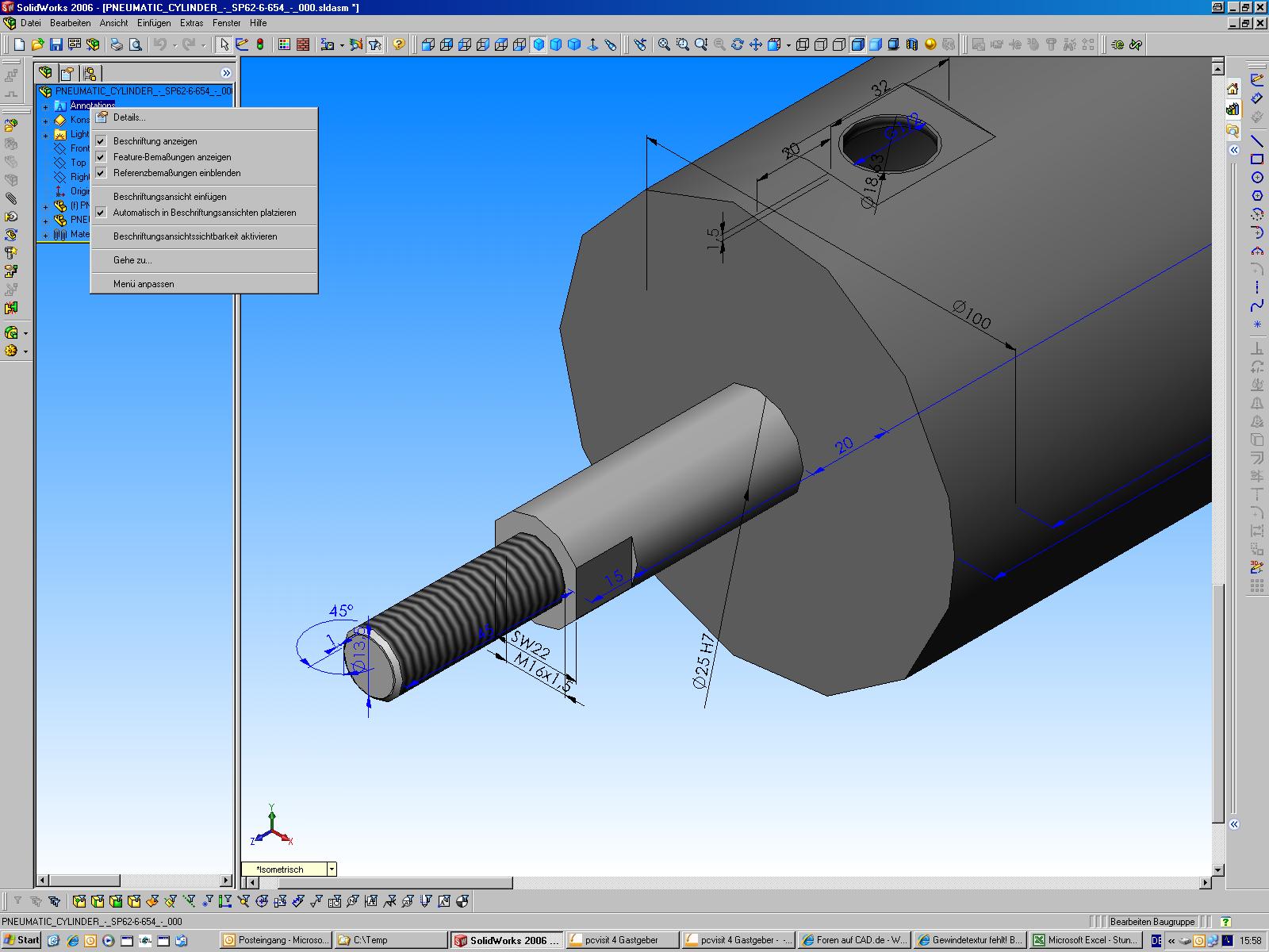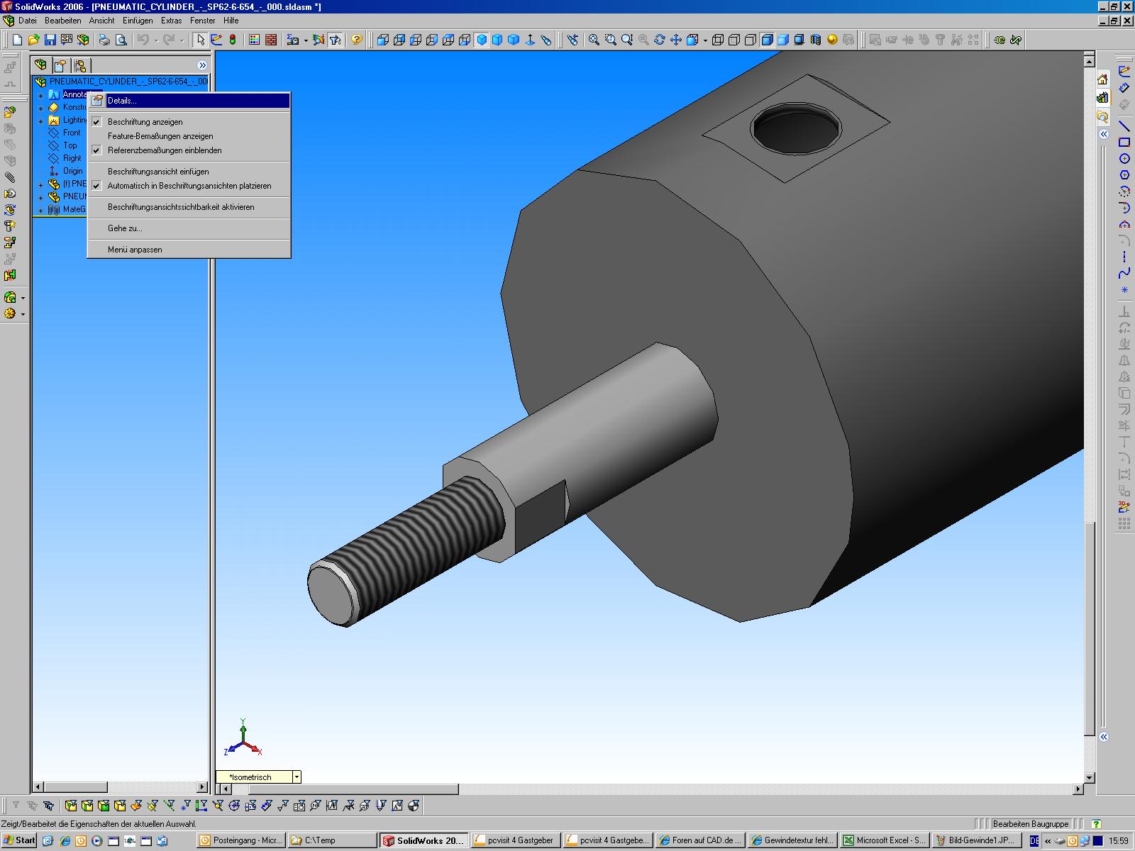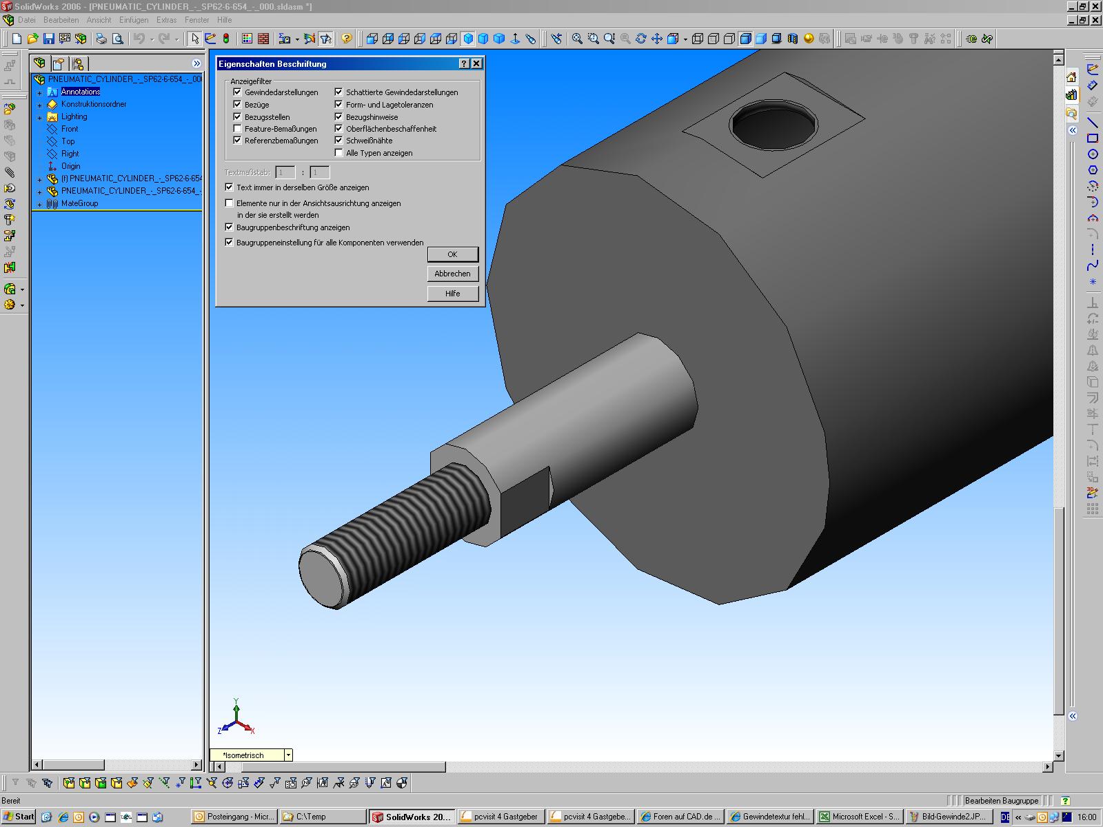 Ja, nach meiner Sichtweise ist das ein Denkfehler. Die Haken im Ansichtsmenu sind die "großen" Schalter, du wirst nur dann etwas sehen können, wenn der entsprechende Schalter im Ansichtsmenu überhaupt eingeschaltet ist. Beispiel Ebenen: du kannst im Featurebaum ruhig eine oder auch mehrere Ebenen einblenden, sehen tust du die trotzdem erst dann, wenn auch im Ansichtsmenu der Haken bei Ebenen gesetzt ist. So ist es auch bei den Beschriftungen: du musst erst mal den Haken im Ansichtsmenu setzen, um überhaupt irgendwelche Beschriftungen sehen zu können. Welche du dann zu sehen bekommst bestimmst du mit den ganzen kleinen Häkchen von den Beschriftungsdetails. Kommen wir nur zu deinem Phänomen der schattierten Gewindedarstellung: da hast du recht, ich kann es bei mir mit der SW2005 und auch noch der SW2006 SP0.0 nachvollziehen, die schattierte Gewindedarstellung ist zu sehen, auch wenn der Haken für die Beschriftungen im Ansichtsmenu nicht gesetzt war. Dazu gibt es nur eins zu sagen: Bugusing Dieses Verhalten, das für dich gewohnt und "normal" war ist tatsächlich ein Fehler gewesen, der in SW2006 SP3.0 gefixt wurde: SW2006 SP3.0 SPR290574 Cosmetic threads are still displayed until after a rebuild after applying the Hide All Types option in the View menu Ich vermute das in diesem Zug auch gleich behoben wurde, dass die schattierte Darstellung bleibt, auch wenn alle Beschriftungen aus geschaltet waren. Deswegen ist das Verhalten jetzt für dich in der SW2006 SP5.1 und SW2007 SP2.0 auch so zu sehen, weil es jetzt eben "gefixt" ist. Und Robert oder ich haben es nicht mal gemerkt, da wir vorher auch schon mit dem Haken im Ansichtsmenu anders umgegangen sind  Ciao, Stefan PS: was bräuchtest du denn jetzt für ein Makro für deine Anwender? ------------------ Inoffizielle deutsche SolidWorks Hilfeseite http://solidworks.cad.de
