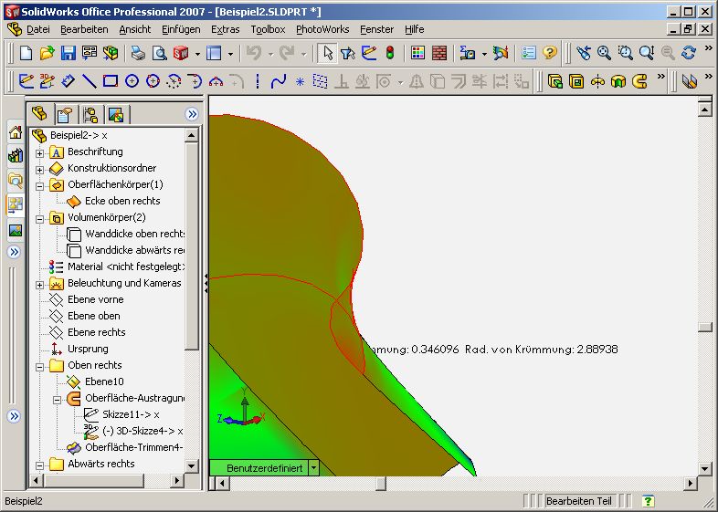 Hallo Arnold, das Programm kann auch nur mögliche Geometrien rechnen (Bei einem 2,8mm dicken Teil würdest Du auch nicht auf die Idee kommen 3mm abzufräsen  ). Was soll SolidWorks denn für Dich tun? Sind die 3mm Wandstärke Dein Ziel? Was meist hilft ist systematische Vorgehensweise. Wie von Lutz vorgeschlagen: Modell analysieren. In Deinem Fall hat mir die Krümmungsanzeige geholfen. Ansicht->Anzeige->Krümmung: wenn Du jetzt den Mauszeiger über die Fläche bewegst, wird die die Krümmung und der entsprechende Radius angezeigt. Standard: kalte Farben -> großer Radius warme Farben -> kleiner Radius Wie Du im Anhang sehen kannst ist da ein Bereich im inneren, der kleiner 3mm Radius ist (im äußeren zwar auch - ist aber unkritisch, da die Aufdickung einen noch größeren Radius entstehen läßt). Zum Verständnis: Probleme beim Offset entstehen immer dann wenn die Anzahl der Kanten/Flächen sich verändert. Bei einfachen geometrischen Formen geht das häufig noch (Beispiel: rechteckiger Kasten mit Aussenradien 5mm. Wandung 10mm einfügen -> keine Innenradien, geht aber... Natürlich wird dann hier die Wandstärke nicht konstant gehalten ). Bei komplexeren Geometrien gibt es keine Automatismen. Zwei Lösungsmöglichkeiten: - Den Spline (3D-Skizze42) so verändern, das der Radius (siehe Anhang) größer 3mm wird. - Statt Wanddicke auftragen die Deckfläche selbst modellieren (Nachteil: unterschiedliche Wandstärken) HTH & bis demnäx, Ralf ------------------ Eine Antwort auf diesen Beitrag verfassen (mit Zitat/Zitat des Beitrags) IP |