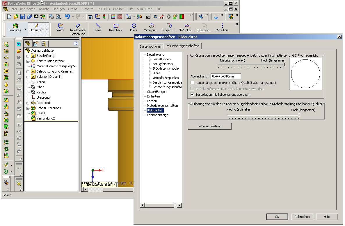Wie Stefan schon geschrieben hat, so schlimm ist der Fehler nicht. Wir haben zwar auch noch andere Teile, welche von den Dimensionen nicht so extrem sind, und ähnliche Effekte aufweisen. Beim Teil hier im Thread sieht man den Fehler aber auch, wenn man die Länge des Teil von 1372.5 auf 130mm reduziert, und den Radius und die Fase unterdrückt oder löscht. In erster Linie ging es mir darum, ob es an der Graka oder am Treiber liegt. Dies scheint aber nicht der Fall zu sein. Gruss und Danke für die vielen Rückmeldungen Jetzt darf ich nocht die Ü's verteilen. Gruss Mike