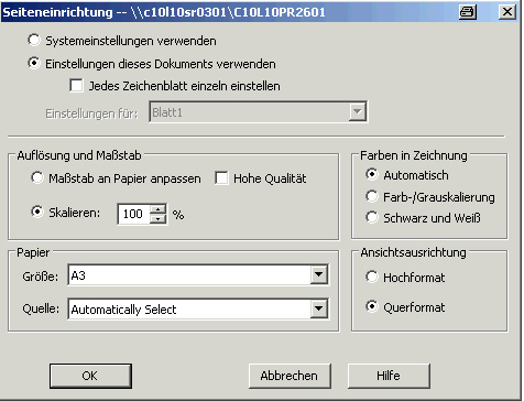Bei meinen Optionen habe ich unter Seiteneinrichtung (siehe JAN) unter der Rubrick Farben in Zeichnungen, Schwarz und Weiß angewählt und so funktioniert es zumindest bei mir auf Laser- und Farbdrucker (auch A4 und A3). ------------------ Gruß Andreas [war BullEyeRed] Einladung zu meinem Gästebuch! --------------------------------------------- Es soll sogar Programme geben, die fehlerfrei sind.  Eine Antwort auf diesen Beitrag verfassen (mit Zitat/Zitat des Beitrags) IP |