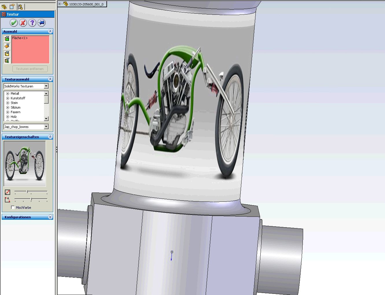 Super das ging ja schnell, Danke. Jetzt habe ich noch ein Problem der Darstellung. Im Einzelteil wird die Textur angezeigt, in der Baugruppe nicht. Die Textur ist im Einzelteil auf der Trennlinienfläche abgelegt. Habt Ihr dafür auch einen Tipp. Gruß Frank Eine Antwort auf diesen Beitrag verfassen (mit Zitat/Zitat des Beitrags) IP |