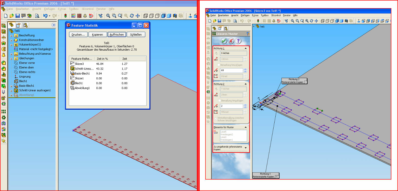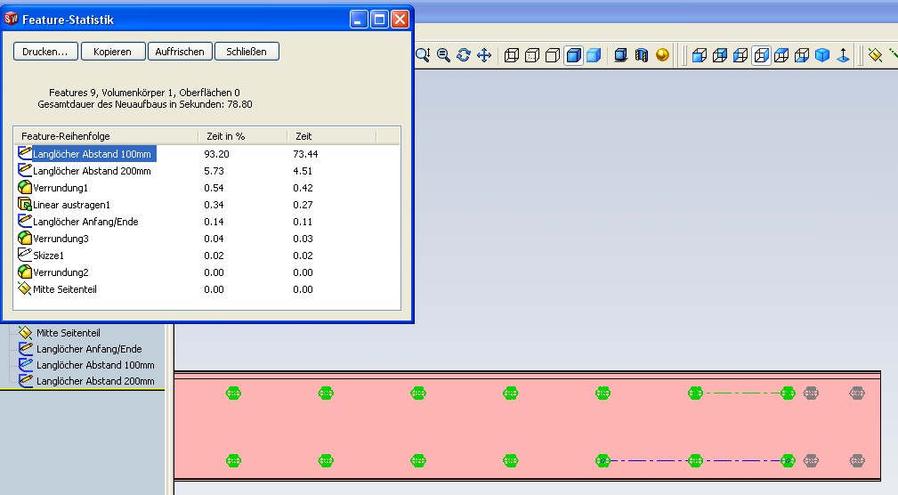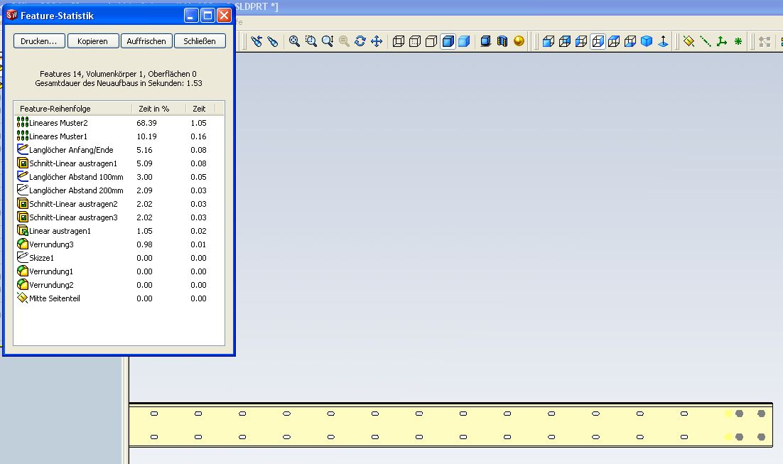 @ pi-design Hab das ganze jetzt mal als Feature Muster gemacht. Und siehe da, ist wesentlich schneller (siehe Bild). Hatte es auf diese Art nicht gemacht, weil bei vorherigen Teilen beim Feature Muster die Perfomance doch ziemlich nachließ. Meine ich zumindest.... Wieder was gelernt @gogoslav Komisch, du benutzt die gleiche SWX Version. Kannst du denn mal bitte einen Scrennshot der Feature-Statistik anhängen? Der Unterschied von 100 zu 200mm ist bei mir doch erheblich. Ich verstehe nur nicht warum das so ist. ------------------ MfG L. Schröter Eine Antwort auf diesen Beitrag verfassen (mit Zitat/Zitat des Beitrags) IP |