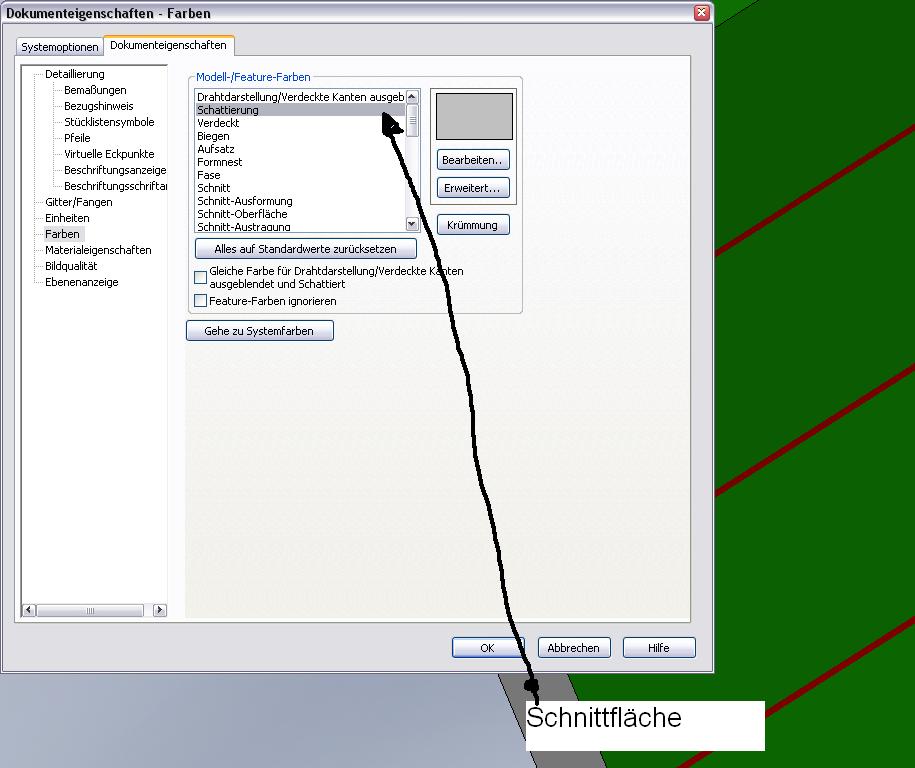 So ich habs jetzt mal so hinbekommen wie es bei dir sein könnte. Ich hab einen Teil eine Farbe verpasst (grau), dann hab ich dem Feature grün gegeben. Also ist der Teil im als Part Grün und Rot (Biegung) dargestellt, wenn ich in der Zeichnung einen Schnitt einfüge ist der Teil, Grau! Das liegt daran dass die Farbe, in diesem Fall Grau, unter Extras -> Optionen -> Dokumenteneinstellung -> Farbe -> Schattierung definiert ist ------------------ Grüße David Eine Antwort auf diesen Beitrag verfassen (mit Zitat/Zitat des Beitrags) IP |