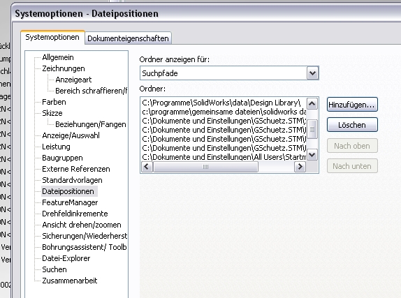 Hm, nur so ne Idee: wenn du ein Toolboxteil auf eine bestimmte Länge gebracht hast, würde ich es unter einem neuen Namen abspeichern. SWX hält jedes Teil (Datei) nur einmal im Speicher. Wenn dieses Teil mit einer anderen Länge schon offen ist, oder gerade offen war, wirst du es wieder in dieser Länge bekommen und nicht mit der, mit der du es (in einem anderen Verzeichnis?) abgespeichert hast. Gegebenenfalls auch die Suchreihenfolge in SWX ändern (siehe Bild) Grüße Günter ------------------ Der Unterschied zwischen Theorie und Praxis ist in der Praxis größer als in der Theorie. Eine Antwort auf diesen Beitrag verfassen (mit Zitat/Zitat des Beitrags) IP |