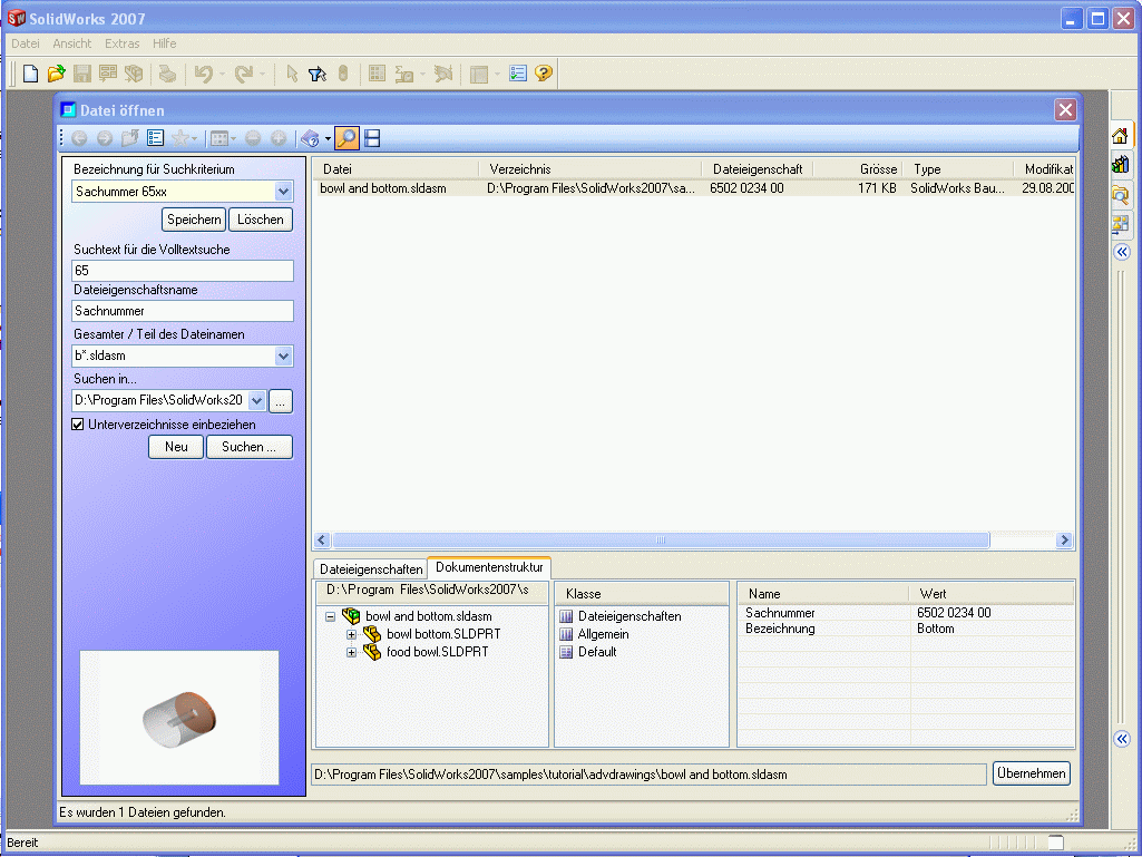 Hallo myca, das freut mich und ich freu mich schon auf die Rückmeldungen.... Hallo, Kriechi, es freut es mich natürlich das es hilfreich ist und die Arbeit vereinfacht. Thema Multithreaing: Ich habe intensive Versuche damit durchgeführt und kann leider keine Lösung für mein Problem finden. Dieser BackgroundWorker lässt sicht leider nicht mit User Control zusammen ausführen. Diese sind nicht Multithread sicher - Da nuss ich eine andere Lösung suchen. anklicken von großen baugruppen dauert sehr lange: Was dauert hier sehr lange - Das Anzeigen der Dokumentenstruktur? Nun zu der Suche: Sie haben die Möglichkeit über die Eingabe im Textfeld "Suchtext für die Volltextsuche" in allen Dateieigenschaften der Dateien nach diesem Text zu suchen. zB. Sie suchen eine Datei mit dem Text "Stahl" und Sie wissen nicht in welchen Dateieigenschaft der Text hinterlegt ist. Dann nutzen Sie dieses Feature. Sollte Ihnen der Name der Dateieigenschaft bekannt sein, so tragen Sie diesen Namen unter "Dateieigenschaftname" ein Dabei könenn Sie noch festlegen bei welchen Dateien die Suche durchgeführt werden soll und anschliessend kann diese Tefferliste gespeichert werden. Im Anhang habe ich ein Screenshot über alle Baugruppen mit dem Dateiname b*.sldasm und den Text "65" in der Dateieigenschaft "Sachnummer" gesucht. Die Trefferliste anschliessend unter "Sachnummer 65xx" gespeichert.