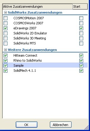 Hallo Marco, habe wie beschrieben die Änderung durchgeführt, Framework NET 2.0 und Hitteam Connect auch neu installiert. Jetzt kann ich zwar in SWX  die Zusatzanwendung ohne Fehlermeldung aktivieren, nur der Öffnen-Dialog ist der Originale von SWX  . Viele Grüße! Thomas. Eine Antwort auf diesen Beitrag verfassen (mit Zitat/Zitat des Beitrags) IP |