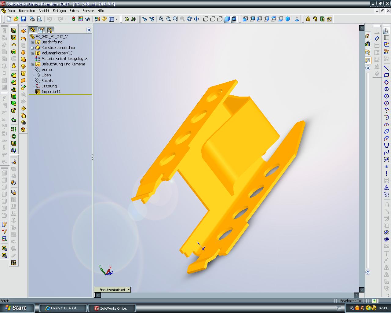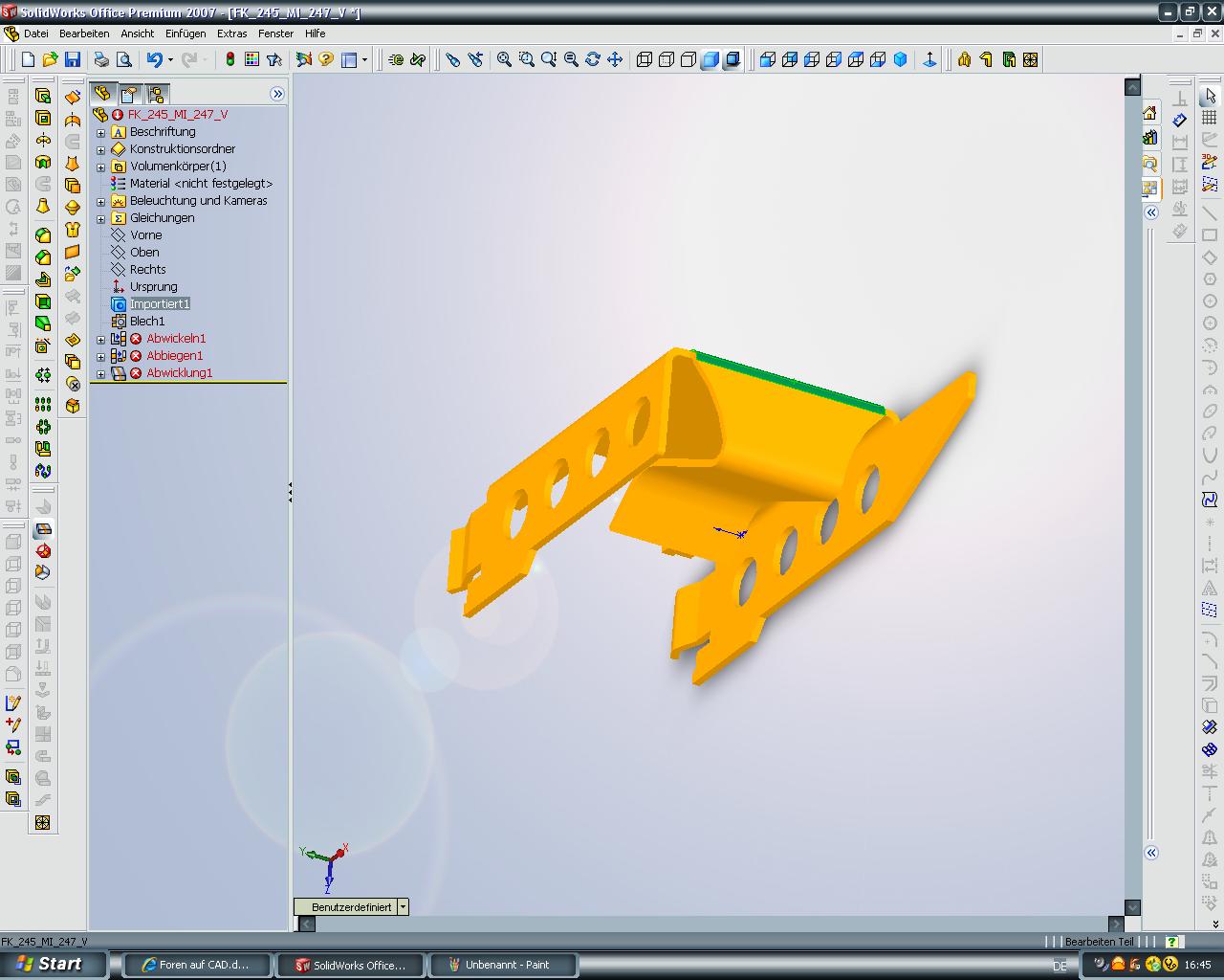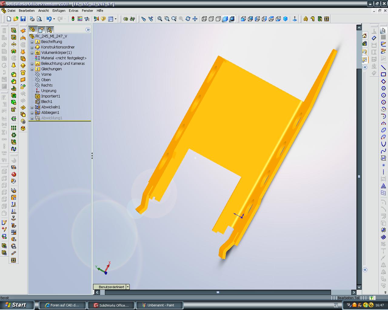 Hallo! Habe ein Ziemlich kompliziertes Teil und möchte den Zuschnitt bestimmen, also das Blech Abwickeln, nur leider gib es da ein Problem! Wenn ich sonst ein Teil abwickle geht das ganz einfach mit : Einfügen-Blech-Biegungen und dann einfach abwickeln! Nur hier fehlt dann die hälfte des teils! siehe Anhang! Kann ich das teil an der trennkante irgendwie trennen und dann einzeln Anwickeln oder hat jemand ne andere Idee! Danke!! Eine Antwort auf diesen Beitrag verfassen (mit Zitat/Zitat des Beitrags) IP |
