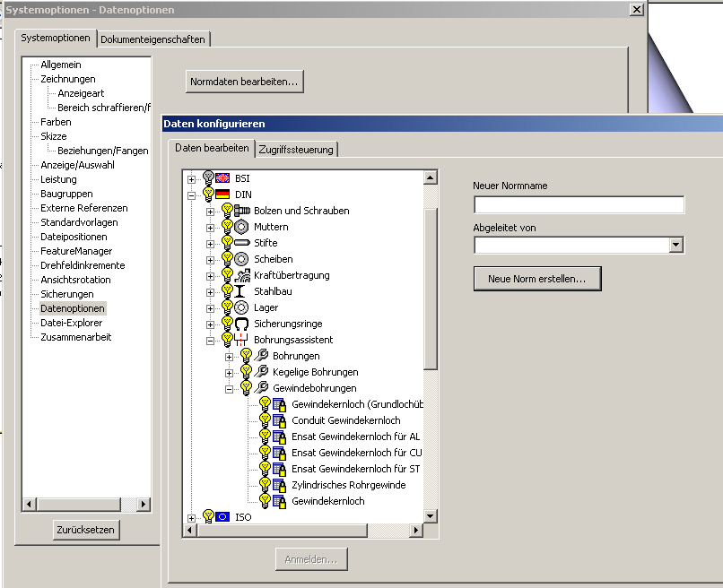 Unter "Extras - Optionen - Datenoptionen" (siehe Bild) Da solltest du mal duchsehen. Allerdings arbeiten wir mit SWX  2006. Es kann natürlich sein, das dies bei SWX  2004 noch anders ausgesehen hat. Wenn du nur lesen kannst, und nicht verändern, schau mal unter dem Reiter "Zugriffsteuierung" nach, ob das bei euch nicht vom Admin gesperrt wurde. ------------------ Grüße aus dem Schwabenland Dieter  Eine Antwort auf diesen Beitrag verfassen (mit Zitat/Zitat des Beitrags) IP |