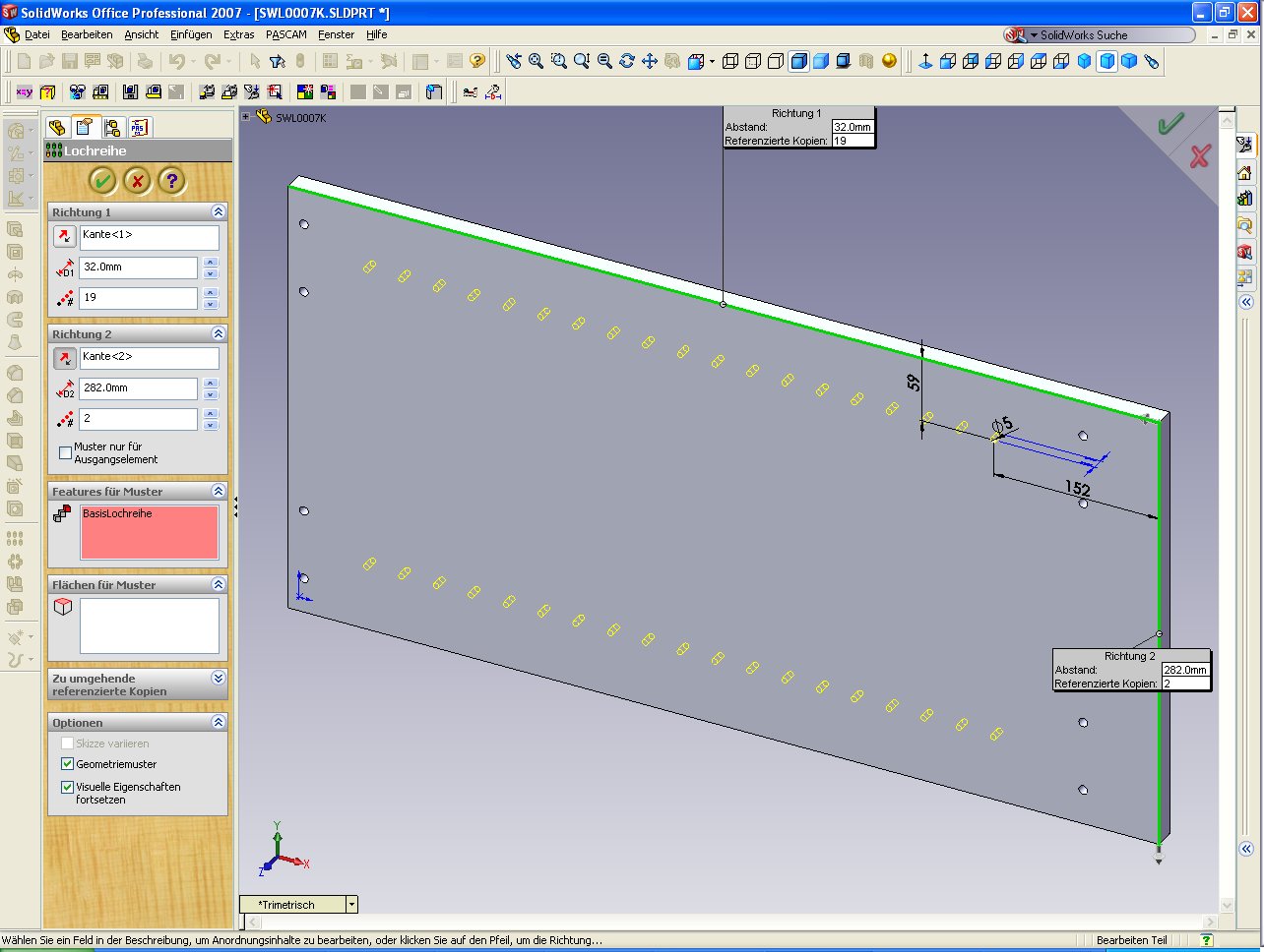 Wenn man nur ein Muster hat dan liegt doch die Bohrung auf dem Original und somit ist da ja kein Material und daher meckert SWX. und somit bestätigt sich auch die Aussage von Mike Zitat: ja, so funktioniert es, aber wenn nur eine Richtung definiert ist, und diese 1 ist, oder wenn zwei Richtungen definiert sind und beide 1 sind, dann "meckert" SolidWorks, da keine Operation ausgeführt wird.