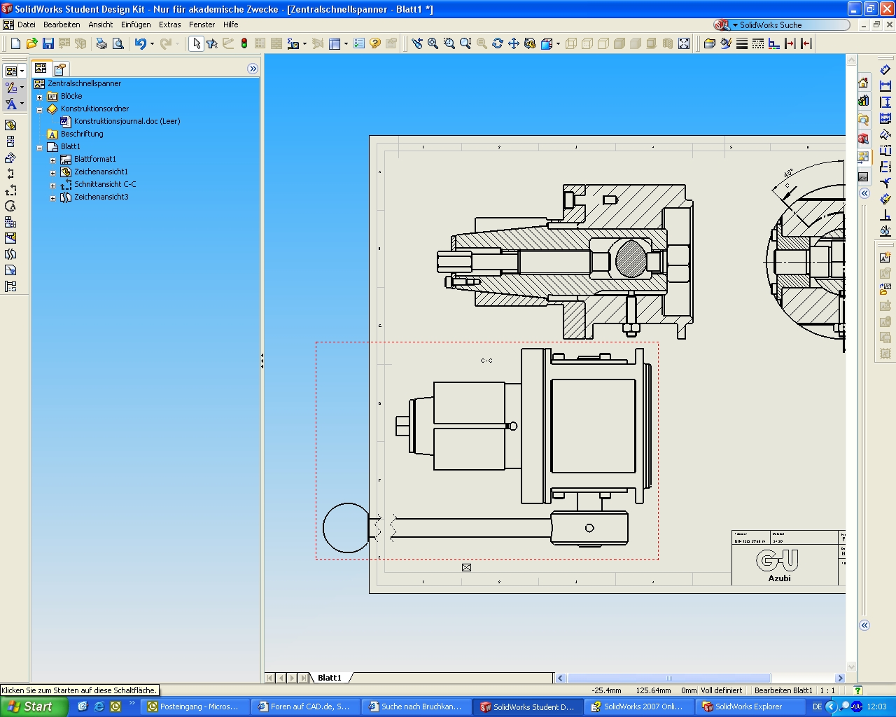 Danke wildcad, ich hab’s jetzt mal so pi mal daumen an die richtig stelle gesetzt. Ich hab die Ansicht gebrochen und dann eine Mittellinie von der Geschnittenen Ansicht nach unten zum ausrichten gezogen. Dann die Ansicht mit der Bruchkante so gut wie möglich mit der Maus hingezogen das die beiden Bündig sind. Mfg Felix Eine Antwort auf diesen Beitrag verfassen (mit Zitat/Zitat des Beitrags) IP |