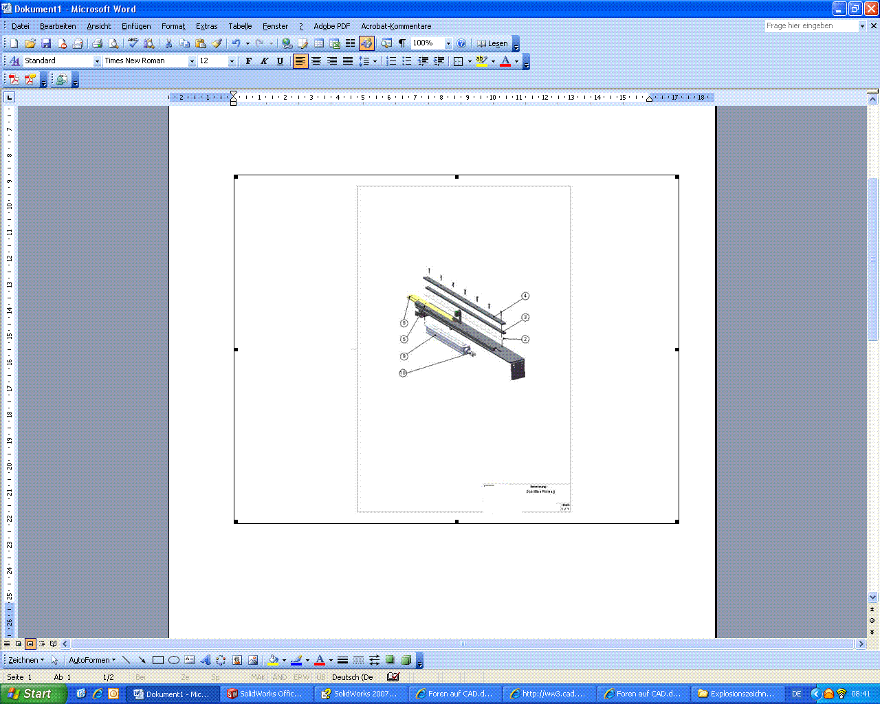 Hi, wie ich schon an anderer Stelle schrieb beschäftige ich mich seit kurzem mit Explosionszeichnungen für unsere Technische Doku. Mit den Expld-Zeichnungen sind wir auf einem guten Weg. Leider ist die Organisation der Dokumentierung nicht so berauschend. Derjenige, der die Doku verfasst benutzt dazu verschiedenste Programme. Wenn alles fertig ist, wird es als PDF zusammengefasst. Dort kann man dann zwar durchgehende Seitenzahlen bekommen, aber leider kein Inhaltsverzeichniss. Das hat mich dann auf die Idee gebracht die Doku mit Word zu machen. Sprich sämtliche Dokumente in Word unter einen Hut zubekommen um dann ein "vernünftiges" Inhaltsverzeichniss zu bekommen. Das existiert in der Doku bislang nämlich nicht!!! Ich habe auch schon diverse Möglichkeiten ausprobiert um die Zeichnungen in Word zu integrieren: -speichern der Zeichnung als Tif und anschließend als Grafik einfügen Hat sich bisher als schönste Lösung erwiesen, leider sind die Tifs recht groß und brauchen so um die 30mb. Das ist den für die Menge an zeichnungen zu viel. -speichern der Zeichnung als JPG und als Grafik einfügen Speicherplatztechnisch die beste Lösung. Quälitätsmäßig--naja Außerdem hat das JPg nach dem einfügen einen wirklich großen Rand, so das die Zeichnung letztlich recht klein ist. -als Objekt einfügen. Qualitativ eine der besten Lösungen, leider wird der linke und obere Zeichnungsrand nicht mit mit angezeigt So denn, ich hänge mal zwei Screnshots an um zu verdeutlichen wie es genau aussieht. Wahrscheinlich sind es ganz banale Sachen. Während ich die Screenshots gemacht habe, fiehl mir auf, dass beim Speichern als JPG der Bildschirmbereich gespeichert wird. Eventuell liegt da ein Einstellungsproblem vor? vielen Dank schon mal im vorraus janbo Eine Antwort auf diesen Beitrag verfassen (mit Zitat/Zitat des Beitrags) IP |