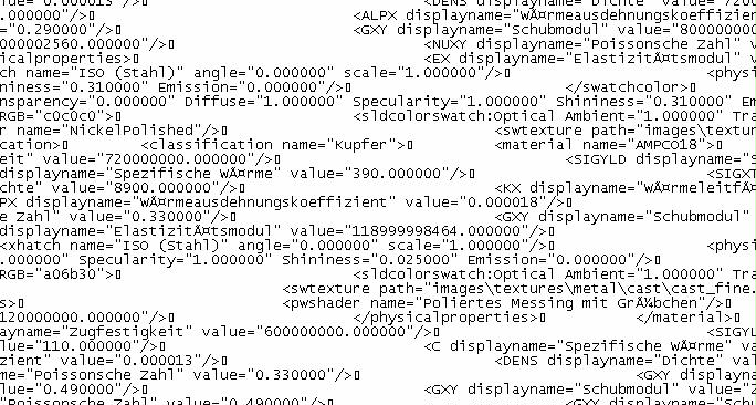 Hallo masls, genau diese Geschichte habe ich grade zum Support geschickt, auch bei uns gibts dieses Problem. Wir arbeiten mit SWX 2006, ich habe vor einigen Wochen auf meinem Rechner SWX 2008 zu testzwecken installiert. Gestern fiel uns dann dieses auf: (siehe Bild 1) Sämtliche Umlaute sind weg, ebenso die ß´s. Ein Blick in die Materialdatei zeigt folgendes: siehe Bild 2 Die Formatierung der Materialdatei ist komplett zerschossen, Grund unbekannt. Evtl. durch die Installation von 2008, das wird aber noch geprüft, mein Support hats in die USA geschickt. Mein Support gab mir fürs erste diese Info: This sounds like an example of SPR 404601 (" Editing and adding a new material to a previous materials database causes polish, norwegian and german characters turn to junk characters."). QA are currently testing a fix for this SPR, which will appear in SP2, pending succesful tests Also, letztendlich hat irgendwas die Materialdatei zerstört, und der Zeitpunkt liegt überraschend nah bei der Parallelinstallation von SWX2008 auf meinem Rechner. Abwarten und Tee trinken. Zum Glück hatte ich ein Backup der Datei. Gruß, Stephan Edit: Wieso funktioniert eigentlich das einbinden von Images in den Thread nicht mehr? Das ging doch sonst? ------------------ "Optimismus ist lediglich ein Mangel an Informationen"