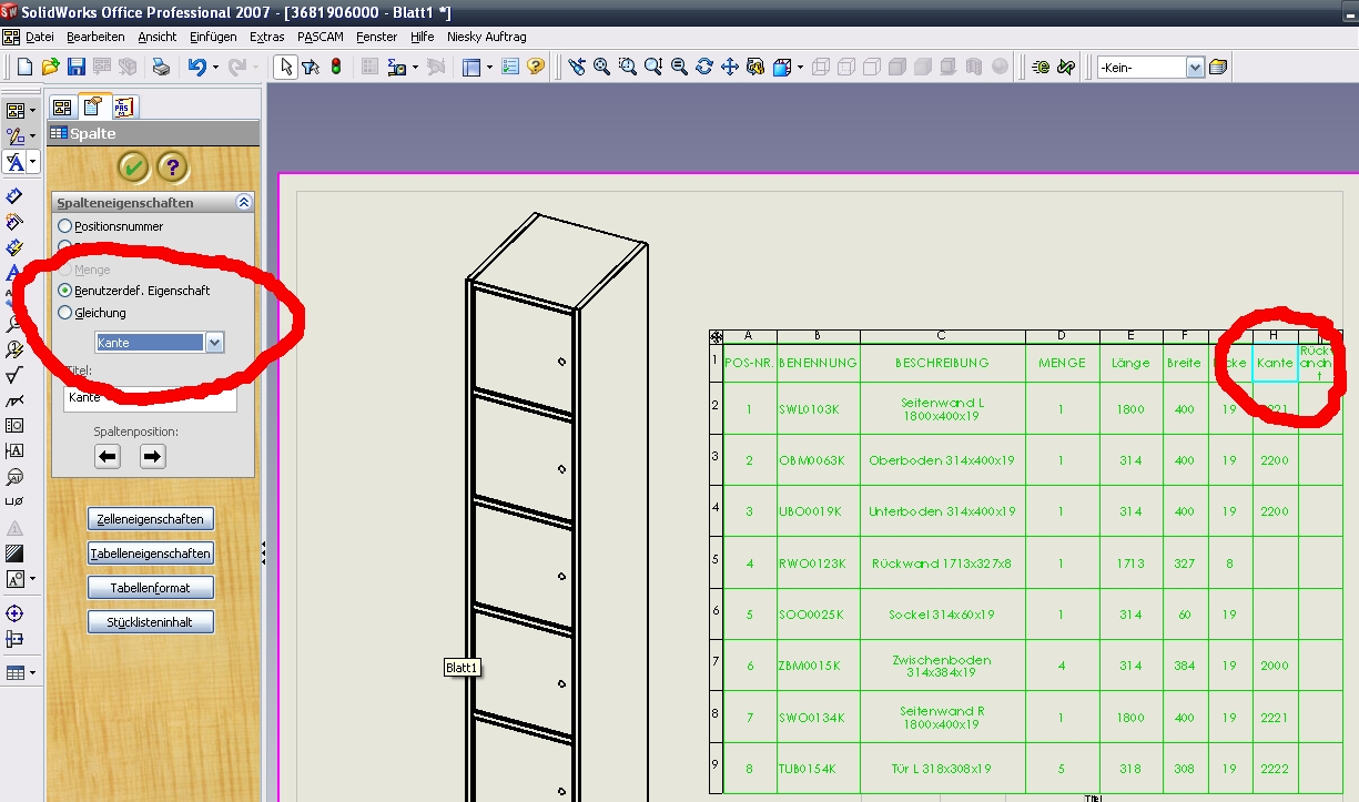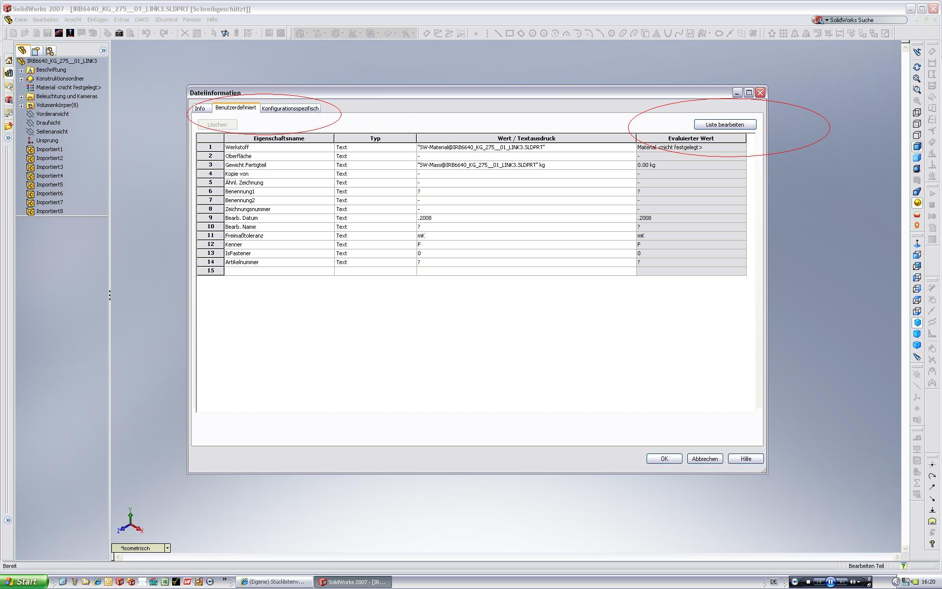 Hi Thomas. Du musst die Eigenschaften im TEIL und nicht in der BG (ausser du willst die Eigenschaften der BG) anlegen. Dazu die Eigenschaften in der Liste (siehe mein Screenshot Liste bearbeiten) anlegen, dann kannst du die bei "Eigenschaftsname" auswählen. Einige Eigenschaften sind schon (z.B. auch Material und Gewicht)in der Liste, wenn du die benutzen willst. Überleg dir welche du brauchst und leg die an. Bei "Wert/Textausdruck" kannst du dann entweder selbst etwas eintragen oder automatisch Gewicht, Werkstoff oder auch Maße eintragen lassen. Alles was dann in den Dateieigenschaften steht kannst du dann in der Stüli auslesen. Johannes ------------------ Faulheit ist der Motor des Fortschritts Eine Antwort auf diesen Beitrag verfassen (mit Zitat/Zitat des Beitrags) IP |