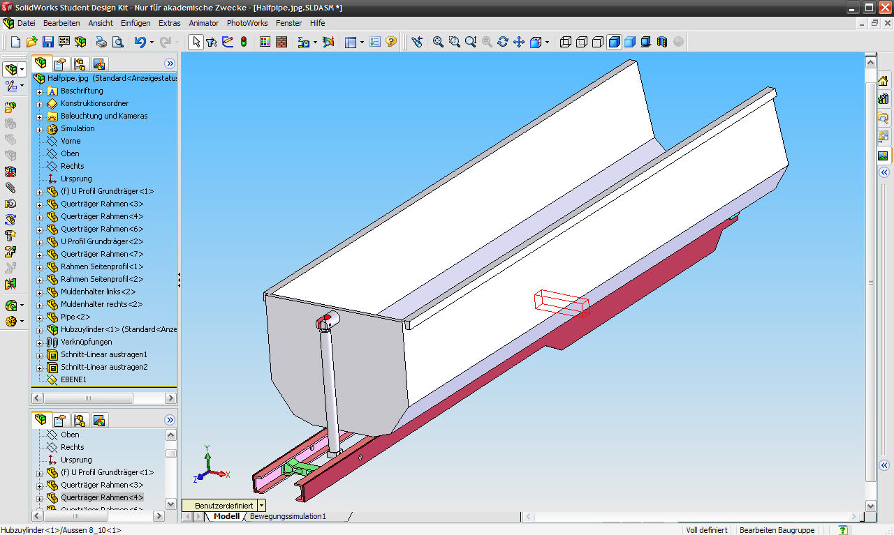 Hallo zusammen, habe ein Problem mit meiner Baugruppe und der Bewegungssimulation. Der Teleskopzylinder im Vordergrund ist eine Baugruppe und der Rest bildet die 2 Baugruppe. Als einzelne Baugruppe bewegt sich der Zylinder. Wenn ich ihn zum Rest hinzufüge und die Bohrungen konzentrisch Verknüpfe ( damit es sich bewegen lässt)dann sind meine Bewegungen nicht mehr Vorhanden. Mache ich da was falsch ? oder muss ich das anders angehen ? Besten dank im voraus. Gruß Tobias