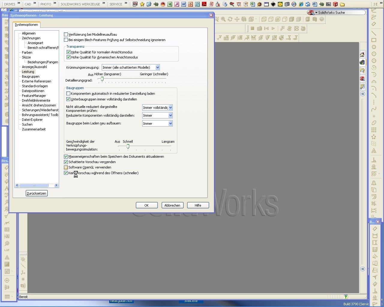 hi j-u-s Also RMT ist die abkürzung für Rechte-Maus-Taste  Und Open-GL ist eine Einstellung die man bei der Grafikkarte machen kann. In diesem Modus werden nur die wichtigsten Einstellungen geladen...somit kein RealView und so weiter in SW möglich. Aber das erklärt dir vielliecht lieber ein Informatiker bin da selber nicht so auf dem Laufenden... Die Einstellung findest du in den SolidWorks-Optionen unter Leistung ganz unten. Kannst du aber nur einschalten, wenn deine Grafikkarte das unterstützt und du keine Dokumente offen hast. Achja: Was hast du für eine Grafikkarte? Evt. kannst du in den Systemeinstellungen der Karte diese auf SolidWorks optimieren... Gruss Dave ------------------ SolidWorks - Master of Disaster  [Diese Nachricht wurde von PFIFFNER am 27. Feb. 2008 editiert.] Eine Antwort auf diesen Beitrag verfassen (mit Zitat/Zitat des Beitrags) IP |