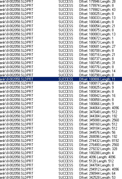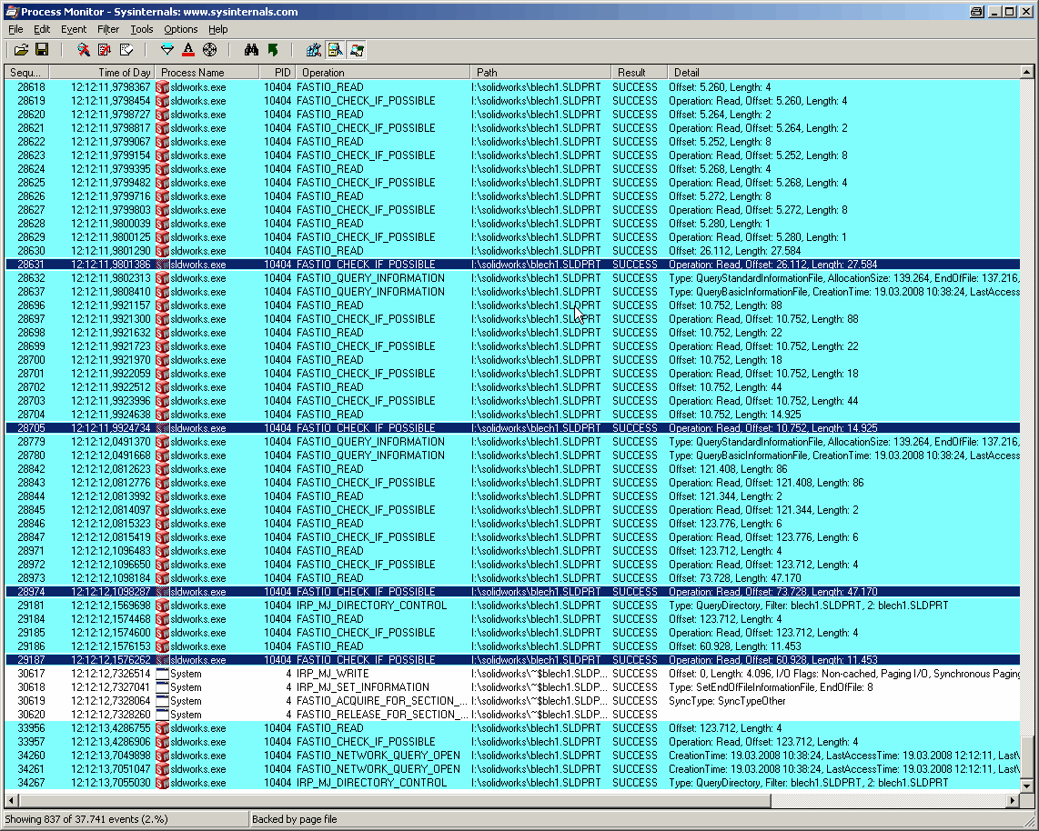 Hallo Horst, icg glaube nicht, dass es etwas mit der Fragmentierung zu tun hat, da diese requests alle von der sldworks.exe ausgehen und auch in diesen teils kleinen Häppchen geschrieben werden. Ich hab da früher schon mal ein bisschen in den Sysinternals Foren danach gestöbert, aber leider keine befriedigende Antwort zu gefunden. Ich nutze wie empfohlen auch mittlerweile den Process Monitor von Sysinternals für solche Zwecke, da steht etwas mehr an Beschreibung und bei den Details dabei (siehe Bild). Ich vermute, dass SolidWorks tatsächlich so viele kleine Anfragen stellt, sequentielles Lesen aus einer Datei, um z.B. an die ganzen Headerinformationen zu kommen, an die grundlegenden Beschreibungen, Featureaufbau (der ja sich nicht im Klartext gespeichert wird) usw. Wie auf meinen Screenshot zu sehen gibt es beim Lesen auch durchaus größere Brocken, da werden dann vermutlich das Vorschaubild, die Displayliste und ähnliches aus dem File gelesen und eben in einem Stück angefordert. Zurück zu deinem Ursprung: wir hatten es auch mit einer älteren Version des eTrust Scanners, dass jeglich Zugriff durch die sldworks.exe argwöhnisch betrachtet wurde und wir erhebliche Einbußen hatte. Wir haben letztlich die sldworks.exe als Prozess in die Ausnahmeliste des Antivirenscanners gesteckt und weg war der Spuk. Ciao, Stefan ------------------ Inoffizielle deutsche SolidWorks Hilfeseite http://solidworks.cad.de Stefans SolidWorks Blog Eine Antwort auf diesen Beitrag verfassen (mit Zitat/Zitat des Beitrags) IP |