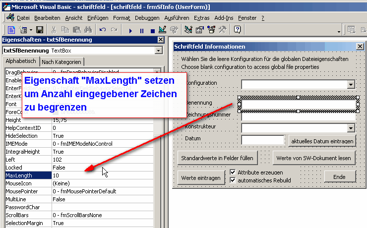 Hallo Garry, klar darfst du das umstricken, dafür ist es ja gedacht. Und zum Lernen, wie man so etwas machen kann. Daher: 1. erledigt 2. Für die Eingabefelder die Eigenschaft "MaxLength" auf entsprechenden Wert einstellen (siehe Bild) 3. Nicht so einfach. Entweder schon das "Neue Part erstellen" mit in dem Makro machen (muss dann auch genutzt werden), ein Makrofeature ins Part in die Vorlage machen (nicht ganz einfach) oder du nutzt das Freeware Addin SDA-4Free, das von Schuler Design über Daniel (aka tbd) hier zur Verfügung gestellt wurde. Ich hab's selbst noch nicht probiert, von der Beschreibung her sollte es aber in dem Punkt Öffnen plus Makro funktionieren. Ciao, Stefan ------------------ Inoffizielle deutsche SolidWorks Hilfeseite http://solidworks.cad.de Stefans SolidWorks Blog Eine Antwort auf diesen Beitrag verfassen (mit Zitat/Zitat des Beitrags) IP |