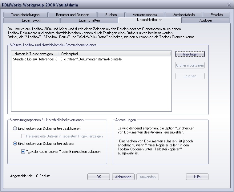 Zum Thema Normteile und einchecken: Es gibt zwei grundsätzliche Vorgehensweisen Das Normteil Schraube DIN 912 ist eine Datei und alle Längen und Durchmesser sind Konfigurationen. Dieses Normteil wird SWX nicht einchecken, sondern sich immer frisch aus dem SWX-Normteilordner holen. (das ist die Voreinstellung von SWX und PDMW) Hier macht ein Read-Only für den Anwender durchaus Sinn. In diesesn Konfigurationen soll er nicht rumspielen. Die gehören dem System. Es wird von jeder einzelnen verwendeten Schraube eine Datei angelegt, die nur diesen Durchmesser und die Länge beeinhaltet. Da ist die Empfehlung, die Schrauben einzuchecken, aber bitte mit geeigneten sprechenden Namen.Du musst das Ganze an zwei Punkten einstellen':