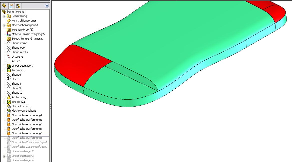 Hallo Klaus, ja, ich füge Flächen und Solids Stück für Stück zusammen. Grün = Volumen Rot = Fläche Bild 1: Mit einem Volumen soweit es geht Bild 2: Oberflächen an die Stellen, wo es nicht mehr geht Bild 3: Das Volumen bis zu den Oberflächen austragen Im Bild 3 siehst du noch die Skizze eingeblendet mit der ich austrage. Die ist leider nicht so deutlich zu erkennen. Im Featurebaum siehst du zudem, dass dich die Oberflächen vorher zusammenfasse. HTH und gute Nacht, ich geh jetzt noch einen Wein trinken. Michael Eine Antwort auf diesen Beitrag verfassen (mit Zitat/Zitat des Beitrags) IP |