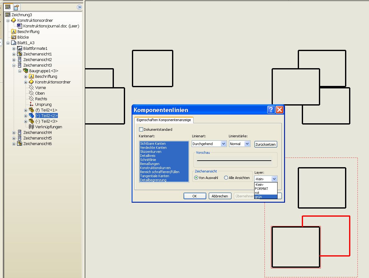 Hallo Leute Ich habe wieder ne recht einfache Frage, die mir gewiss jeder sofort beantworten kann aber ich hab da irgendwie ein Brett vorm Kopf. Ich habe eine Baugruppe mit mehreren Teilen, die verschiedene Farben haben. Diese Baugruppe bringe ich auf die Zeichnung. Mein Kunde möchte aber, dass sich auf der Zeichnung (Drahtmodel, nicht schattiert) genauso farbig unterscheiden, wie im 3D. Somit sollen die Drahtmodelle in der Zeichnung die gleichen Kantenfarben haben, wie sie auch im 3D-Teil vorhanden sind.