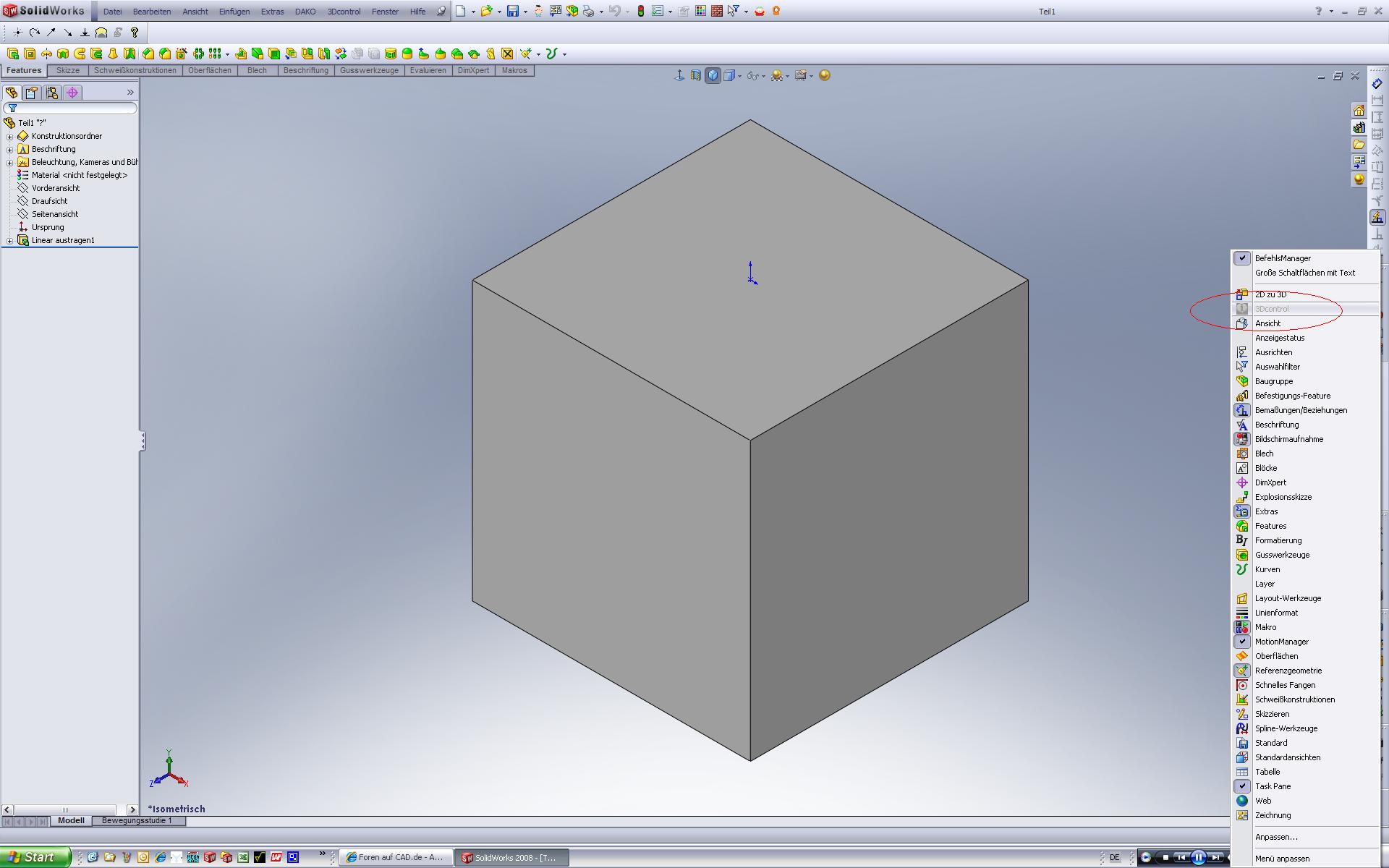 Jetzt gehts bei mir!! Hab SWX  ohne 3Dcontrol gestartet (Bei Zusatzanwendungen beide Haken deaktiviert), wieder beendet, nochmal gestartet und 3Dcontrol wieder aktiviert. Jetzt bleibt die Leiste wo ich sie haben will und der Haken (siehe Beitrag weiter oben) ist auch nicht mehr ausgegraut. Frag mich bitte keiner wieso das gefunzt hat, aber es tut... Johannes Edit: Evtl. funzts so auch mit der Toolbar von MaxxDB? ------------------ Faulheit ist der Motor des Fortschritts [Diese Nachricht wurde von Dr Sutton am 02. Jun. 2008 editiert.] Eine Antwort auf diesen Beitrag verfassen (mit Zitat/Zitat des Beitrags) IP |
