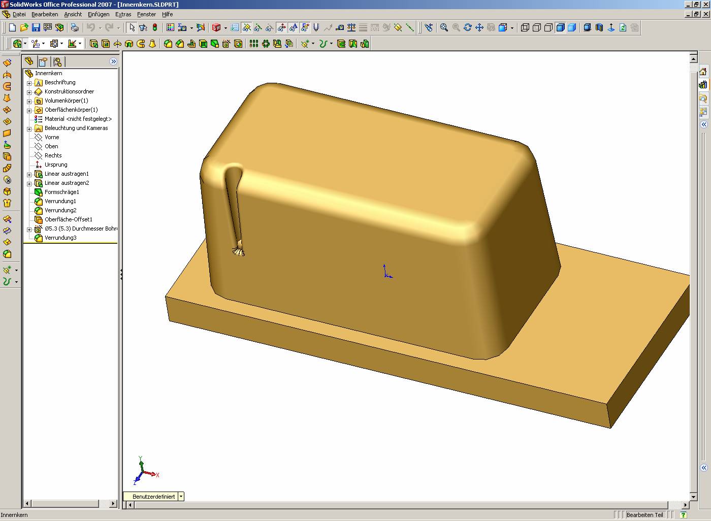 Hallo Eduard, Schonmal mit Volumenkörpern gearbeitet? Aus beruflicher Praxis habe ich mal eine Modeellierungsstrategie von Pro/E auf SWX übertragen. Ich habe nur 2007 (was Du nicht lesen kannst.) Also, die Idee ist die, dass man immer nur positive Volumen hat, die von einander abgezogen werden. 1. Dazu erstellst Du dir den Innernkern (also das Volumen im Innerern deiner Wanne) soweit, die du eine gleichförmige Wandstärke haben willst (Wand, Schraubenpfeifen mit den Rundungen, Schrägen usw. 2. Mache dort einen Flächenversatz nach Außen. 3. Du fügst den Innenkern in ein neues Teil (Außenkern) ein und blendest den Voluemnkörper aus. 4. Die Oberfläche schließt du durch weitere Flächen, um ein Volumen zu erzeugen. 5. Jetzt imortierst Du Innen- und Außenkern in ein neues Teil (Rohteil) 6. Darin kombinierst Du Innen und Außenteil (Abziehen) und hast so ein Volumen mit konstanter Wandstärke. Jetzt kommt die Funktionalität. Innenkern: - alles was VOR der Offset-Fläche liegt geht automatisch als konstante Wandstärke in das Rohtei ein. - alles was DANACH kommt ist nur innen sichtbar. Außenkern: - alles was nach der Kombination steht wird nur außen abbgebildet in Rohteil. Rohteil: - hier kommen Features rein, die über Innen- und Außenkern gehen (Rundungen usw.) Als Higlight fügst Du das Rohteil wieder in ein neues Teil ein und versiehst es mit allem was mechanisch bearbeitet wird. Also Fertigteil.
