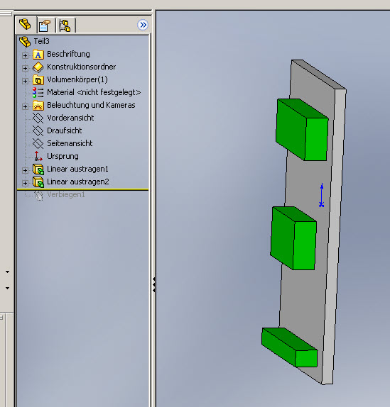 Genau das gleiche Problem hatte ich auch. Bei uns nennt sich so eine biegsame Platine Flexprint. Und zwar kommt die Platine erst mal in einem Stück und gerade daher. Dann wird von dem Print von einer Seite her so weit alle weggefräst bis nur noch eine dünne Verbindung bestehen bleibt die auch biegsam ist. Am besten ist du schneidest das Ding in 2 Teile sodass 2 Körper im Teil vorhanden sind. Neue Konfig anlegen und ein Teil in die passende Lage verschieben und als Verbindung zwischen beiden Teilen einen Spline mit Dünn austragen. HopeItHelps Gruss Alex ------------------ Na gut, dann tu ich's...  Eine Antwort auf diesen Beitrag verfassen (mit Zitat/Zitat des Beitrags) IP |