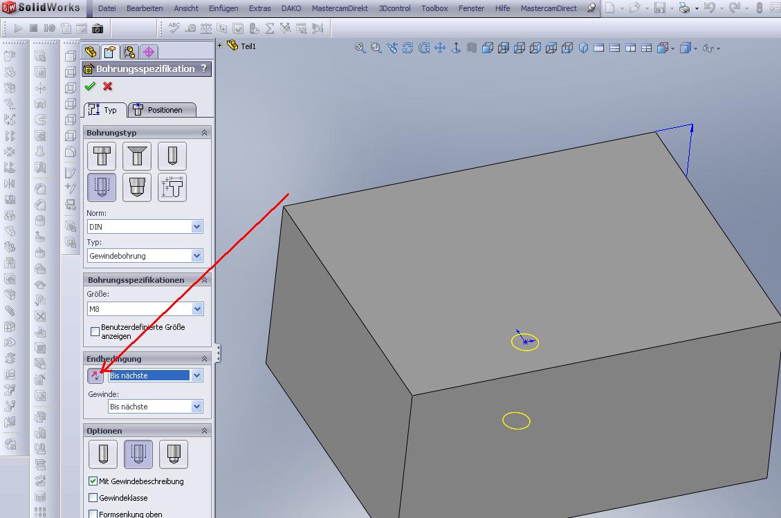 Hallo Brödlahans, Sorry dass ich mit dem Zylinder etwas verwirrung gestigtet habe. Es geht nicht um die runde Geometrie. Es geht darum dass die Richtung für die Bohrungsaustragung nicht geändert werden kann, wenn man den Bohrungsassi auf einer Standardebene plaziert. Scheint allerdings bei allen Ebenen so zu sein. Gruss Mike ------------------ The Power Of Dreams Eine Antwort auf diesen Beitrag verfassen (mit Zitat/Zitat des Beitrags) IP |
