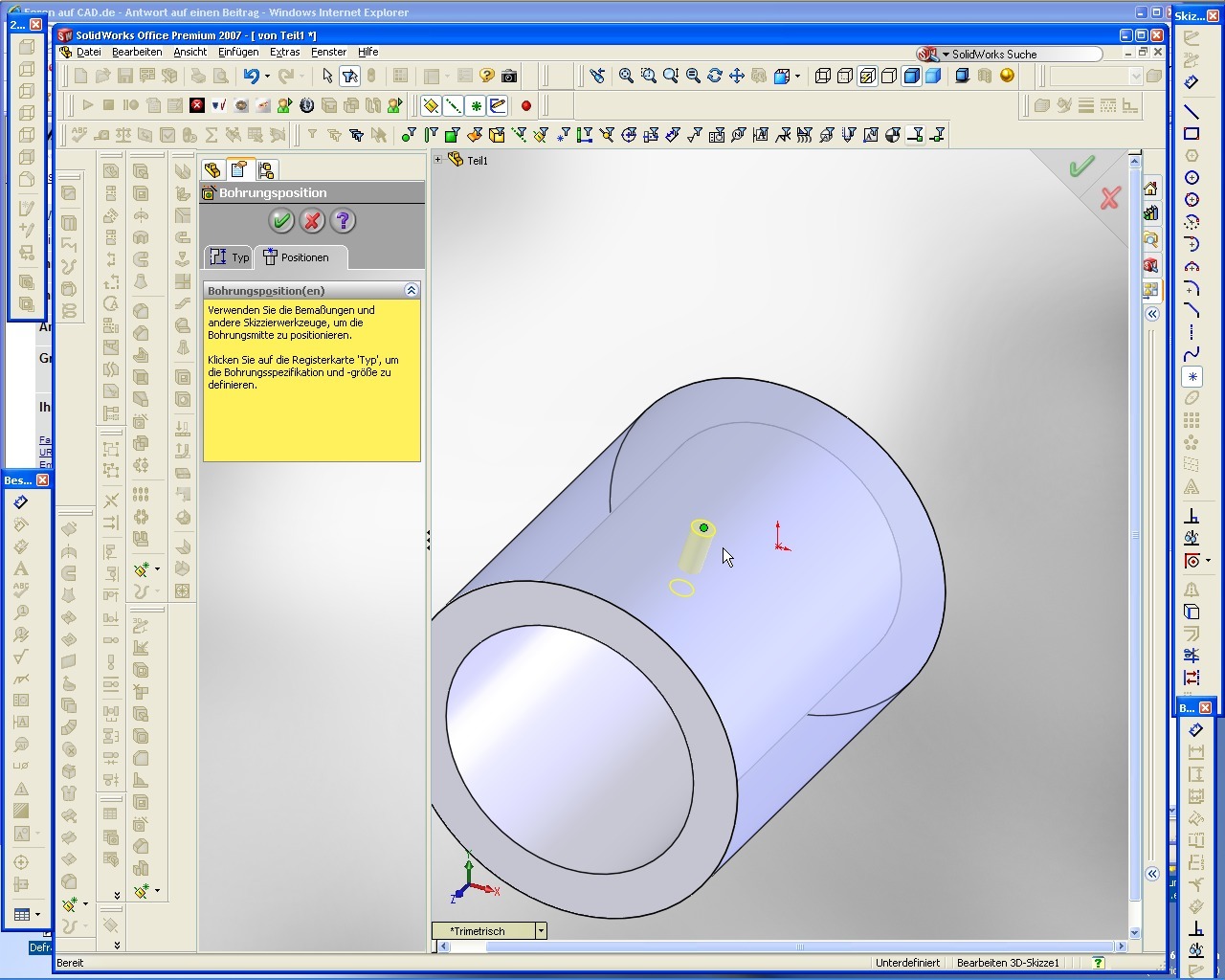 Hallo, Hab einen Zylinder erstellt. Wollte jetzt ein Gewinde in den Zylinder schneiden. Hab dazu eine Standardebene angewählt, und dann den Bohrungsassi gestartet. Nun kann ich aber die Bohrrichtung nicht ändern. Der dafür vorgesehene Button bewirkt nichts. Habs im 2006 (SP5) und im 2008 (SP0) probiert. Mache ich jetzt was falsch oder ist das ein Bug in der Software? Einen Workaround benötige ich nicht, habe ich schon. Gruss Mike ------------------ The Power Of Dreams Eine Antwort auf diesen Beitrag verfassen (mit Zitat/Zitat des Beitrags) IP |