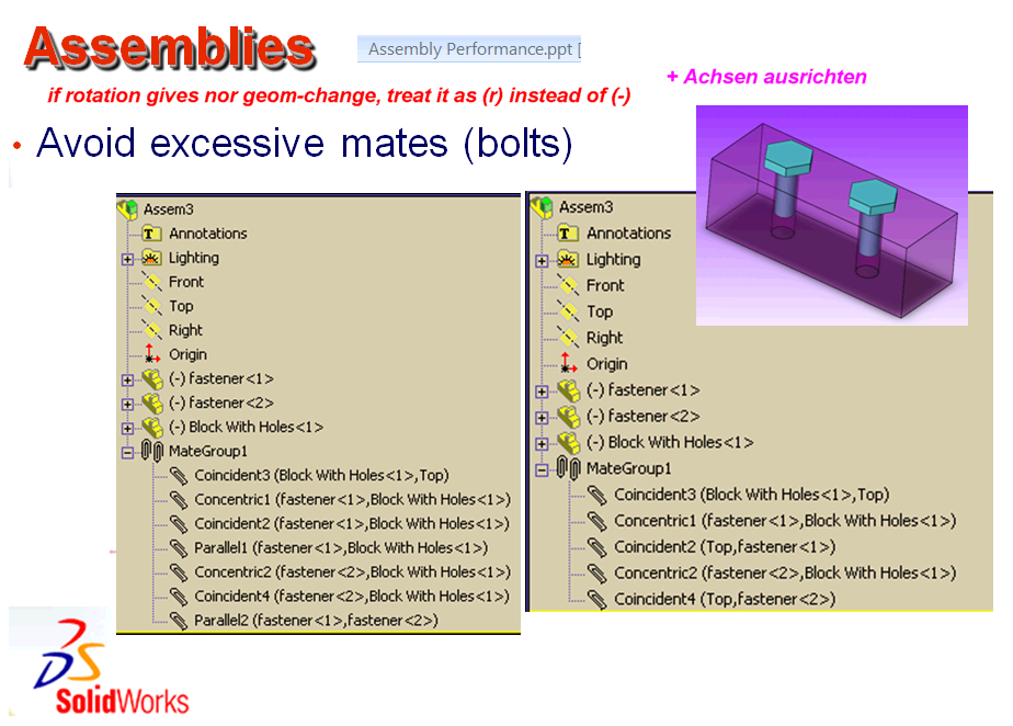 Bei usn sind einige Kollegen dazu übergegangen, Schrauben und Stifte in ihren Bohrungen auch rotatorisch voll zu definieren, da feststeht, daß Schrauben und Stifte, die noch den rotatorischen Freiheitsgrad haben, ganze Bewegungsabläufe behindern/ blockieren können, weil die Berücksichtigung dieser Freiheitsgrade für die Simulation/ Bewegungsberechnung schon bei kleineren Baugruppen ab 30-50 Teile für SWX zu aufwändig ist, da bewegt sich teilweise nix mehr.
