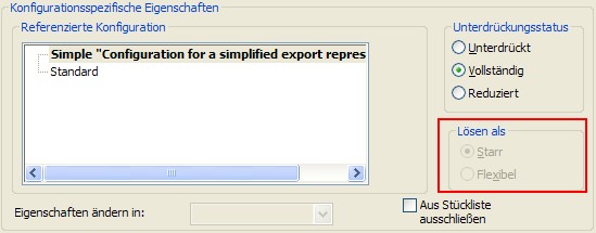 Guten Morgen Gilbert, danke für das Testen, ich bin auch wieder einen Schritt weiter gekommen. Es liegt an dem Wert der Variablen eSwComponentSolvingOption, welcher durch oSwComponent.Solving definiert wird. Dieser ist bei mir -1, da die Einstellung "Lösen als" inaktiv ist (siehe Bild). Mit -1 als Parameter solving will die Methode CompConfigProperties4 aber nicht. Leider habe ich keine Ahnung was diese Einstellmöglichkeit "Lösen als" überhaupt bewirkt und warum diese bei meiner Komponente inaktiv ist. Ich würde mich daher sehr freuen wenn mir ein erfahrener SolidWorks Anwender ( ja Gilbert auch du bist gefragt ) folgende Fragen beantworten könnte: