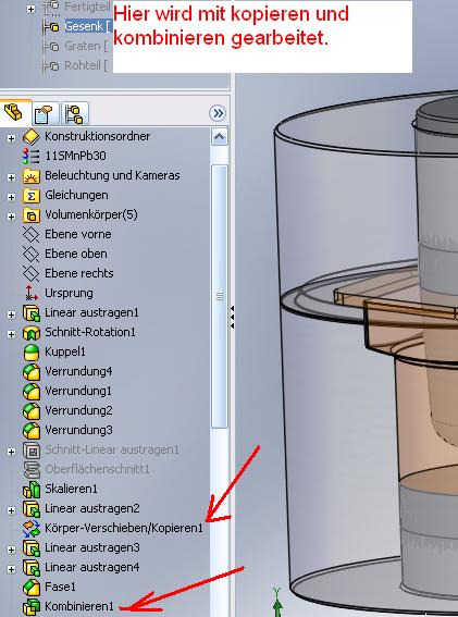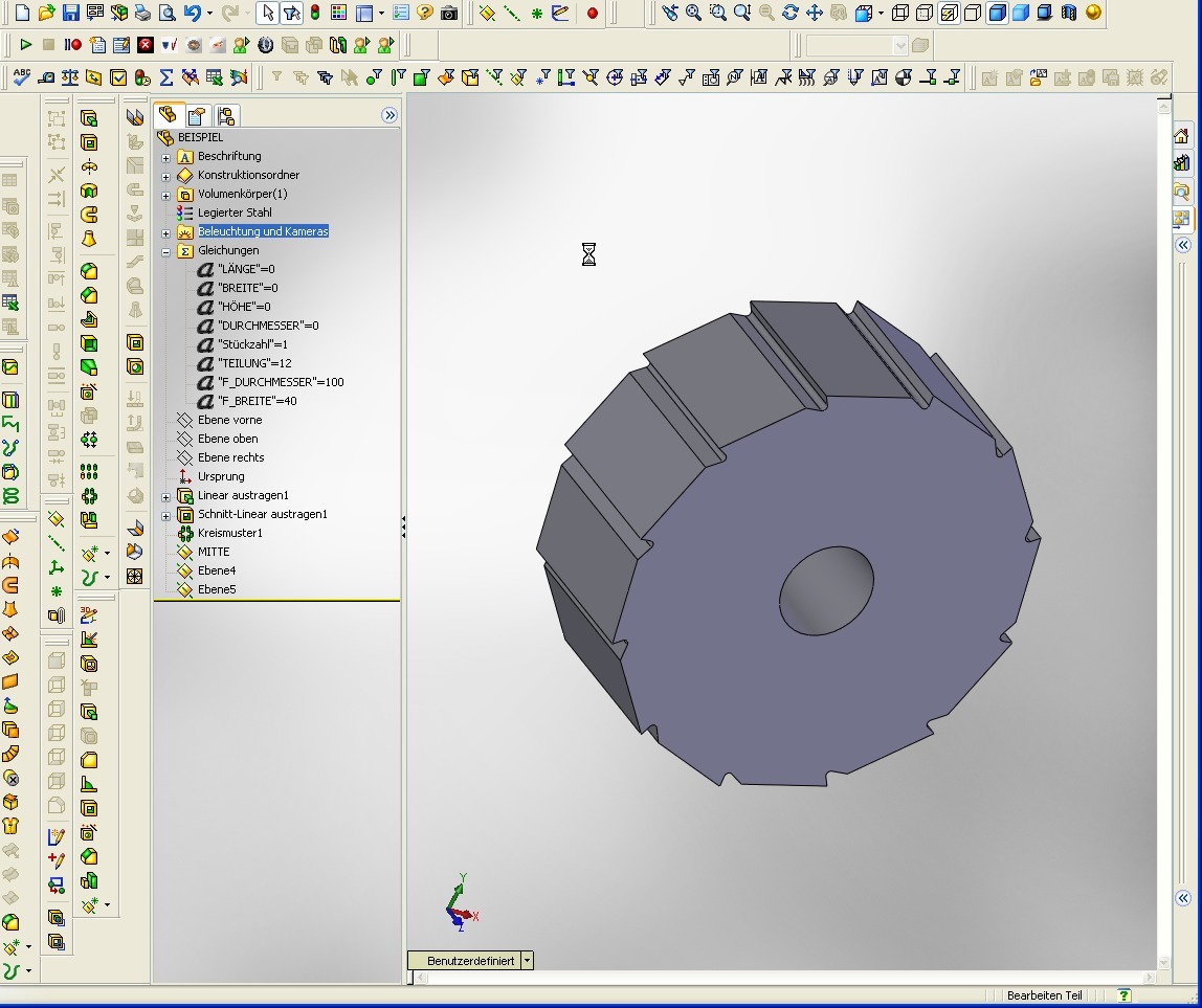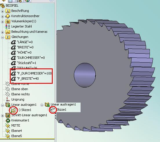 Hi... @T.C. Vielen Dank!! das hat mir viel geholfen. Hab es jetzt zwar ohne Formnest gemacht aber das Ergebniss passt trotzdem. @myca wie gesagt das mit den Gleichungen hab ich soweit verstanden. Mein Problem war wie du die Gleichung der Breite (in Bsp1 )in das Feature Austragen gebracht hast? Mein neues Problem ist: Zitat: die steuern die Skizzen Bemaßung von der Rotation