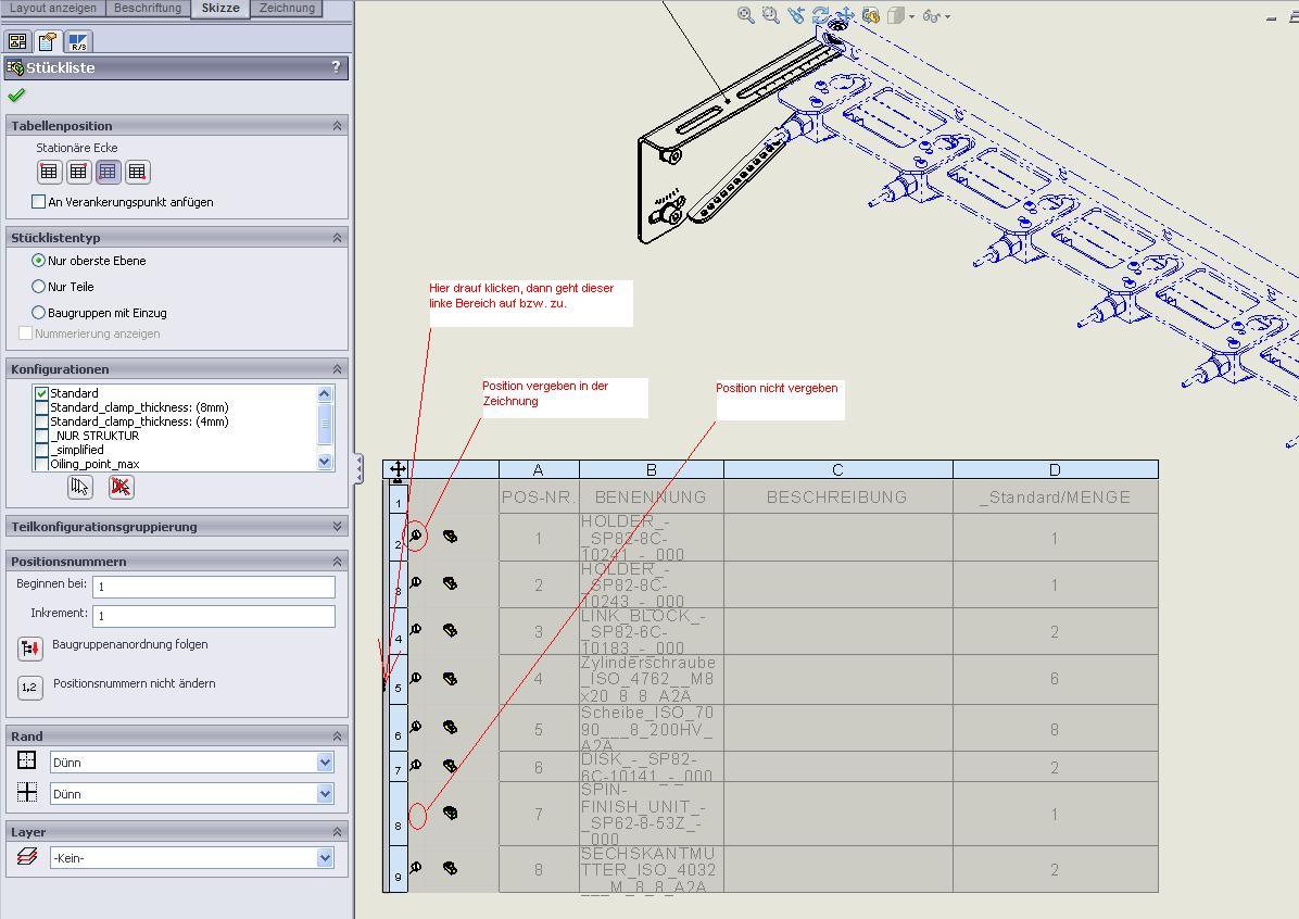 Hallo, ja in der internen Stückliste von SW gibt es im linken Bereich, den man per Mausklick öffnen kann einen Bereich der mir ein Pos. Symbol anzeigt wenn eine Pos. auch in der Zeichnung vergeben ist. MFG Robert Hess. Eine Antwort auf diesen Beitrag verfassen (mit Zitat/Zitat des Beitrags) IP |
