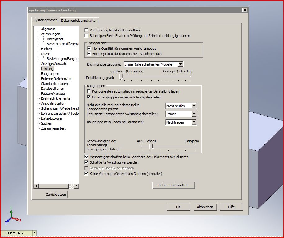 Ja, spontan von einem Tag auf den anderen ist eher ungewöhlich; vor allem, wenn du als Anwender den Unterschied bemerkst liegt die Differenz deutlich über 20%, alles darunter wird ohne Messprogramme eigentlich nicht wahrgenommen. Mit ist allerdings auch noch nicht klar, bei welcher Aktion du diese Verlangsamung bemerkst. Du schreibst beim Wiederaufbau ... wird der von dir selbst durchgeführt per Ampel oder CTRL-Q, ist das Laden entsprechend langsam, sind neue Komponenten in der Baugruppe und müssen neu durchgerechnet werden, kommen die Komponenten auf einmal (oder schon immer?) von einem Netzlaufwerk und in eurem Netzwerk wird auf einmal etwas anders gemacht, liegt es an den Verknüpfungen (einfach mal eine neue Konfiguration machen und alle Verknüpfungen unterdrücken), wurde z.B. der flexible Status von Baugruppenhierarchien geändert, passiert das auf Baugruppen- oder Zeichnungsebene, wie ist die Auslastung deiner Prozessumgebung (Taskmanager oder Processmonitor) ... viele Fragen, ohne entsprechende Infos ist da nur Mutmaßen und Hellsehen angesagt. Ciao,Stefan