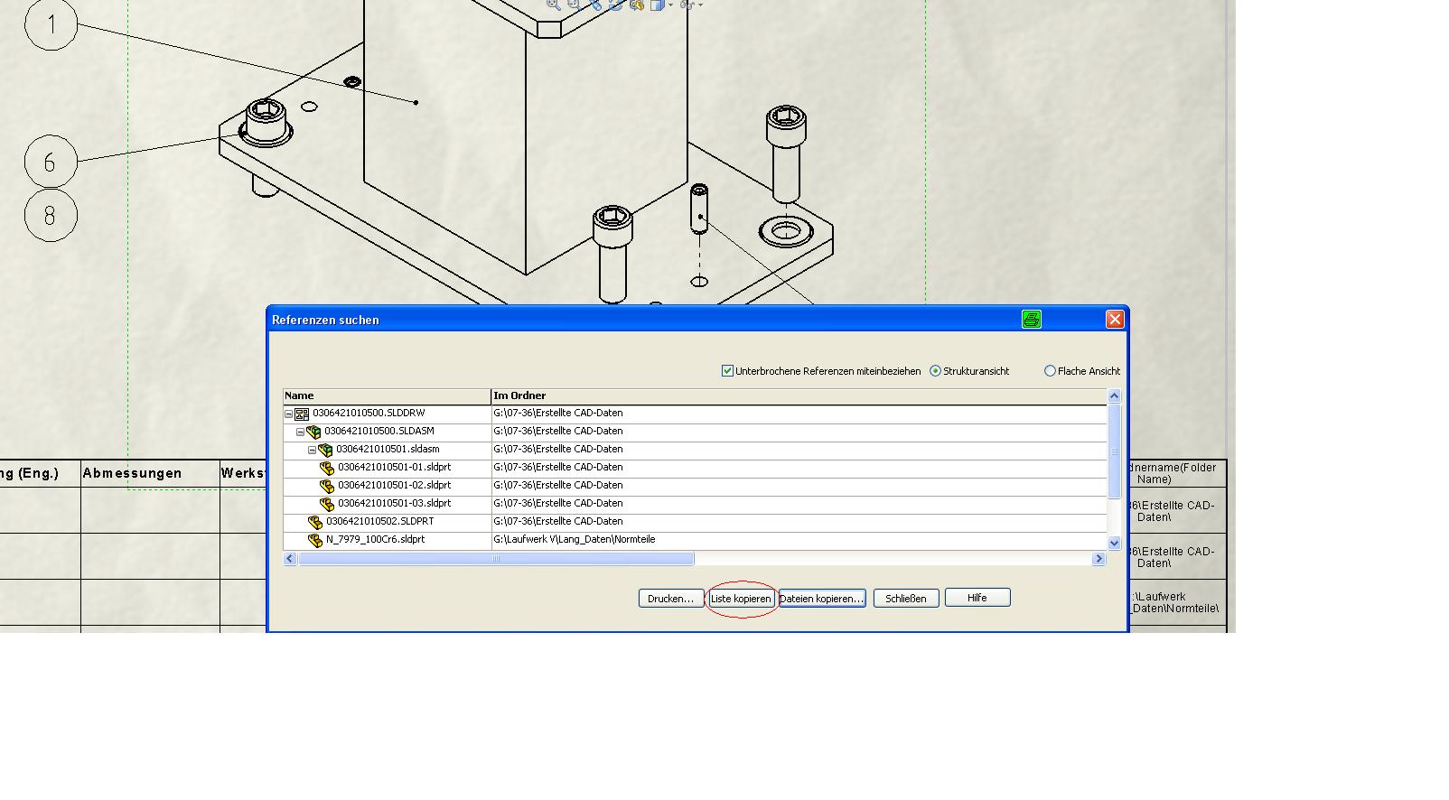 Hallo Robert, ich habe mal ein kleines Beispiel erstellt (siehe Strukturbaum). Wenn ich auf Referenzen suchen gehe bekomme ich das wie in "Referenzen suchen". (Leider etwas anders als bei dir, könnte an der Version liegen). Die Stückliste ist gut, nur fehlt die Struktur der untergeordneten Baugruppen. Optimal wäre eine Liste (exportierbar) die die Struktur aus Pack and Go enthält. Nur wie bekomme ich diese? Gruß Stephan