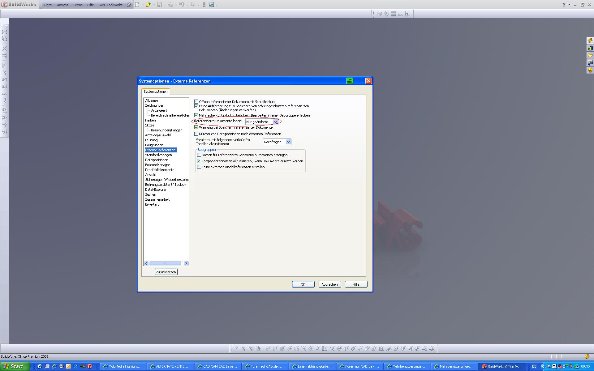 Hallo Fredy, wir arbeiten bei uns seit ca. 3 Jahren mit der Mehrbenutzerumgebung und sind im Grunde ziemlich zufrieden damit. Am Anfang gabe es etwas mehr Absürze dadurch, aber nach einem Service-Pack war dieses Problem auch im Griff. Unsere Philosophie ist hierbei folgende: Wir laden Baugruppen grundsäzlich alles immer im reduzierten Modus, aber so daß er alle Modelle mit ihrem letzten Stand zeigt (in Systemeinstellungen so eingestellt) bzw. wenn nowendig aktualisert. In diesem Zustand haben ich alle in der BG enthaltenen ET's mit schreibschutz geladen. Da ich in der Regel nur mit zwei 2-3 Modellen (meistens ja ET's)beschaftigt bin, kann jemand anders jederzeit die anderen enthaltenen Modelle mit schreibzugriff laden (ohne das ich dies akiv unterstüzen muß). Bei dieser Vorgehensweise brauchst Du auch niemals fremde Dokumente (Modelle) schreibschützen. Macht diese Vorgehnsweise auomatisch. Die restlichen Fragen hat Lutz ja schon beantwortet. Vor allem bezieht sich diese Option zum Schreibschutz nur auf andere Dokumente. Die Bezeichnung "externe Referenzen" ist meiner Meinung eigentlich doppelt vergeben. Wichtig ist noch der Haken in diesem Zusammenhang bei "Externe Referenzen"(s.Bild), der halt für die Akualsierung von z.B. gespiegelten Teilen oder Ahnlichem zuständig ist. MFG Robert Hess. Eine Antwort auf diesen Beitrag verfassen (mit Zitat/Zitat des Beitrags) IP |