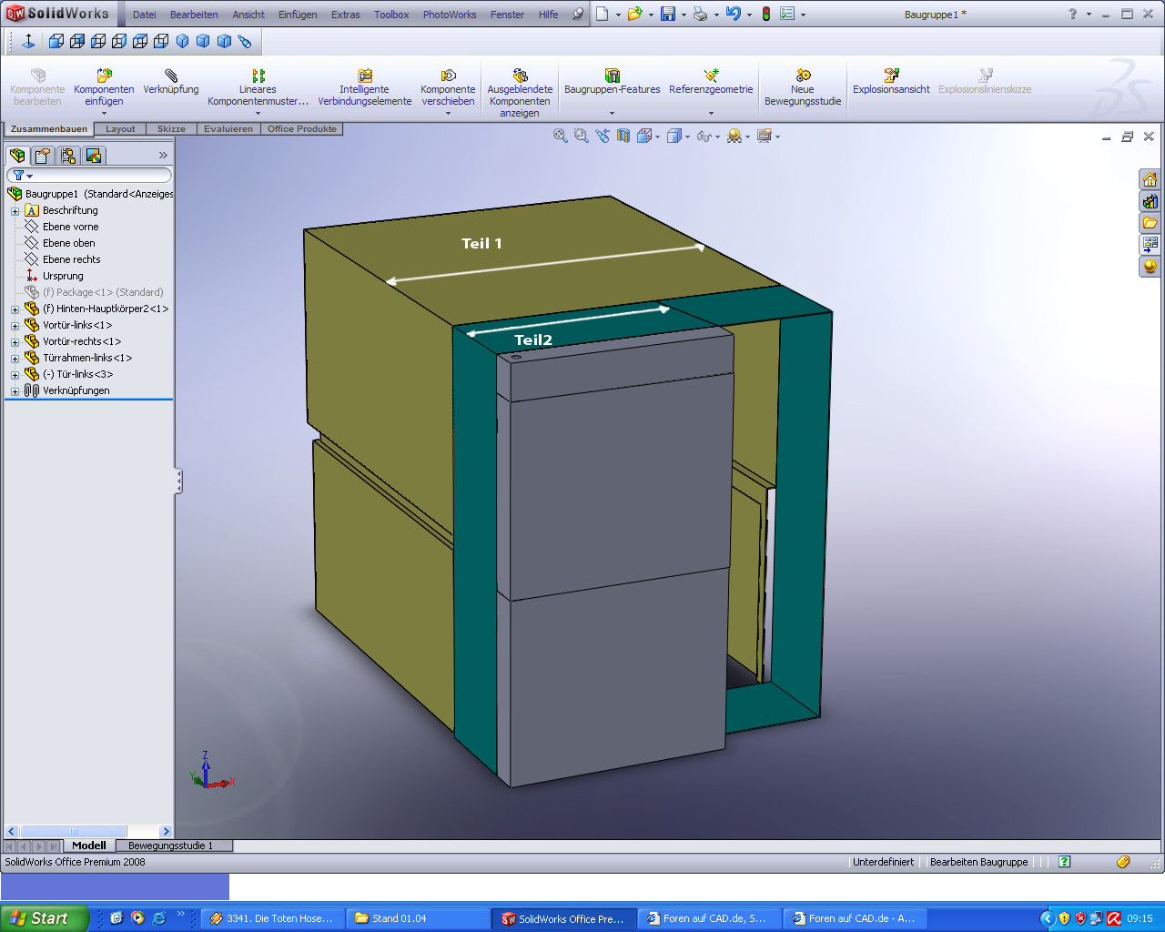 erst mal danke schön für alle eure Antworten! Ich hab mal ein Screenshot von einem konkreten Beispiel gemacht wo vlt klarer wird was ich eigentlich möchte =) Dies ist soll die Außenhülle einer Maschine werden, was rein geometrisch eine einfache Geschichte ist. Ich möchte nun Beispielsweise aber die Breite von Teil 1 ändern. Dabei soll sich die Breite von Teil 2, ohne dass ich manuell noch irgendwas ändern muss, die Breite an Teil 1 angleichen. Das das über Variablen und Gleichungen funktioniert war jetzt mein erster Gedanke..aber vlt geht es ja auch irgendwie anders. Am Ende soll, wenn das möglich ist, an den Breiten und Längen der Teile rumgezogen werden können und dabei sich die jeweiligen anderen Teile immer angleichen. Das hat den Sinn, falls sich das Package im Inneren ändert, würde man so schnell angleichen können. Eine Antwort auf diesen Beitrag verfassen (mit Zitat/Zitat des Beitrags) IP |