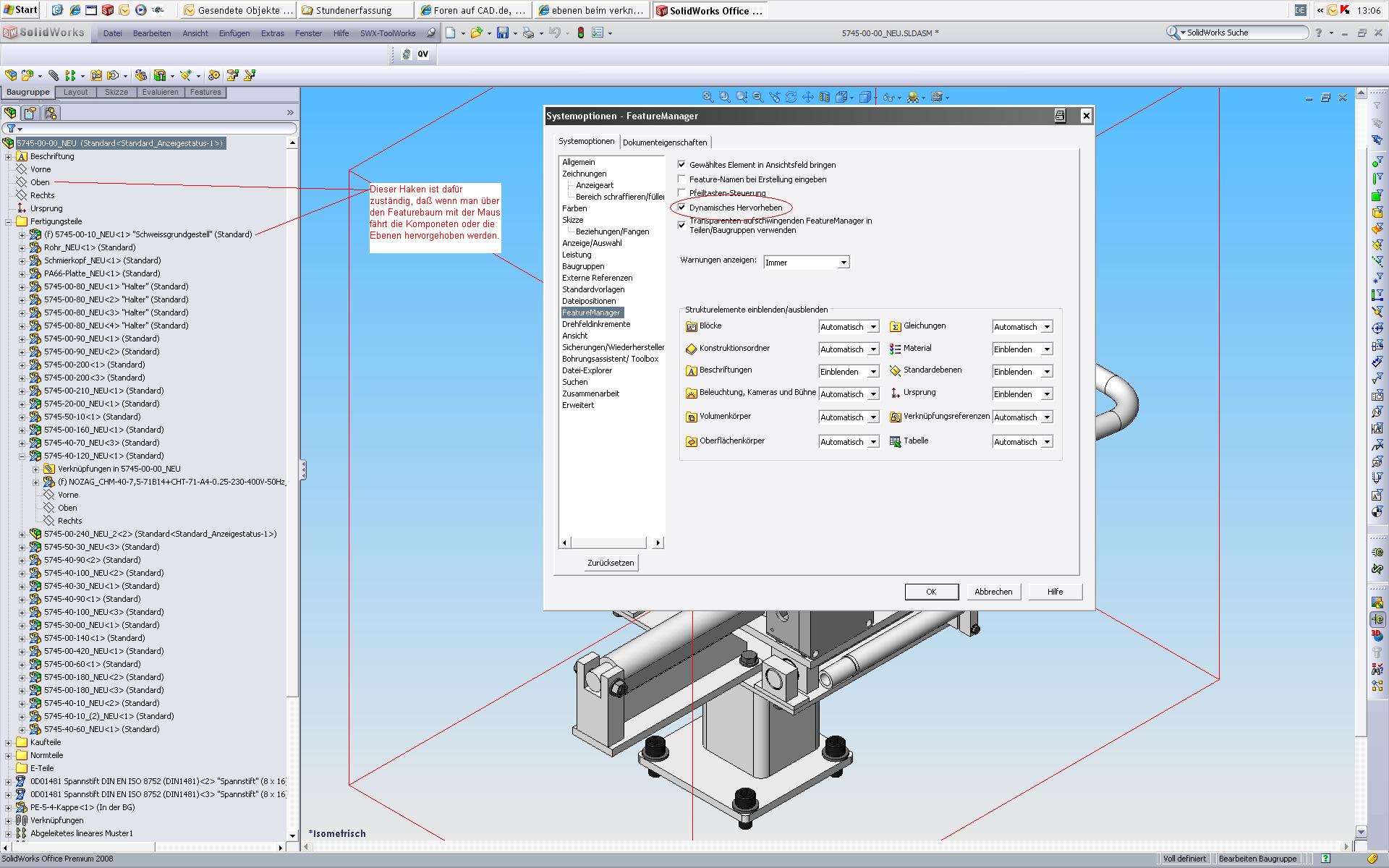 Hallo Solid-Works Gemeinde Ich habe mal eine ( ziemlich dumme )Frage... Wenn ich in einer Baugruppe Komponenten miteinander verknüpfe, konnte ich sonst immer die Ebenen der einzelnen Komponenten sehen, wenn ich mit dem Mauszeiger im Strukturbaum darüber gefahren bin. Obwohl über die Brille Ebenen anzeigen aktiviert ist, sind die Ebenen immer nur sichtbar, wenn ich sie anklicke. Dementsprechend sind die Ebenen dann nach dem anklicken auch im Verknüpfungsmanager. Wenn ich die falsche Ebene angeklickt habe, muß ich sie natürlich wieder aus dem Verknüpfungsfenster löschen und das nervt und kostet viel Zeit. Wo kann ich die Sichtbarkeit der Ebenen aktivieren, sobald ich nur mit dem Mauszeiger im Baum darüber fahre, ohne sie erst anklicken zu müssen? Eine Antwort auf diesen Beitrag verfassen (mit Zitat/Zitat des Beitrags) IP |