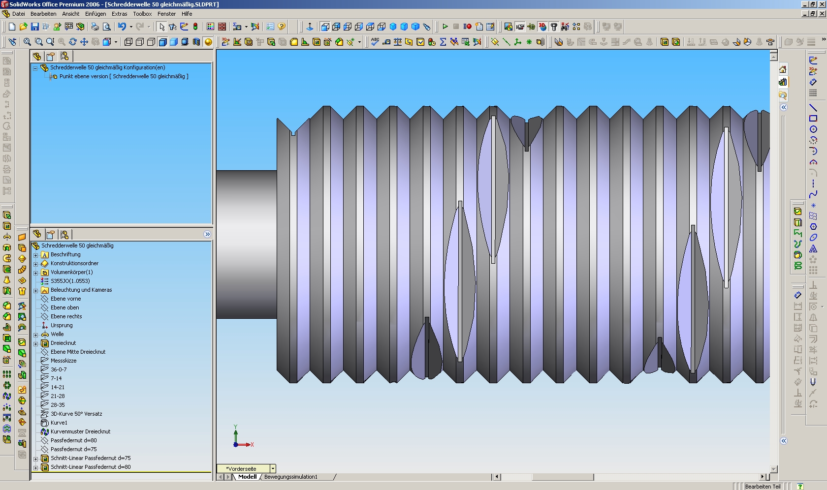 Hallo Eduard, anbei eine Idee. Leider nur als Bild, weil ich jetzt gerade sehe, daß Du nur SW2006 hast. Sollte Dir aber reichen, um Deine Welle zu erstellen. Soll der Winkelversatz von einer Bearbeitung zur Nächsten eigentlich 50° sein? MFG Robert Hess. P.S: Ich habe mir um den Einbau der Bauteile (vermutlich Messer oder ähnliches) keine Gedanken gemacht. Eine Antwort auf diesen Beitrag verfassen (mit Zitat/Zitat des Beitrags) IP |
