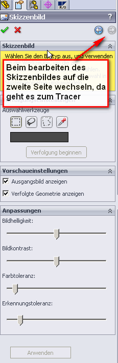 Hallo Mike, Du musst unter Extras->Zusatzanwendungen Autotrace einschalten. Dann gibt es im FeatureManager oben (direkt unter dem Hilfefragezeichen  ) zwei weitere Schaltflächen, die rechte davon heißt "Weiter". Vorausgesetzt Du hast ein Skizzenbild eingefügt, bist am bearbeiten des Skizzenbildes der Skizze... Viel Spaß beim Versuch, Ralf ------------------ Eine Antwort auf diesen Beitrag verfassen (mit Zitat/Zitat des Beitrags) IP |