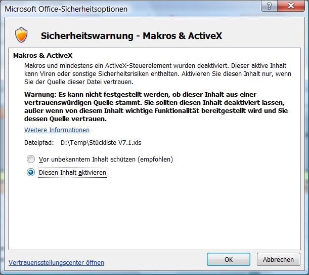 Hallo golipuc, ich habe dir mal eine kleine Anleitung geschrieben: - Baugruppe in SWX öffnen und aktivieren - Die Exceldatei öffnen. - Den Zugriff des Makros erlauben (Inhalte aktivieren) siehe Foto 2 - mit rechter Maustaste in ein freies Feld der Excelliste klicken - Im Menü den Punkt "Aktualisieren" auswählen - Stüli wird eingelesen Schau doch mal, ob du so weit kommst... ------------------ ########################### Gruß Andreas Eine Antwort auf diesen Beitrag verfassen (mit Zitat/Zitat des Beitrags) IP |