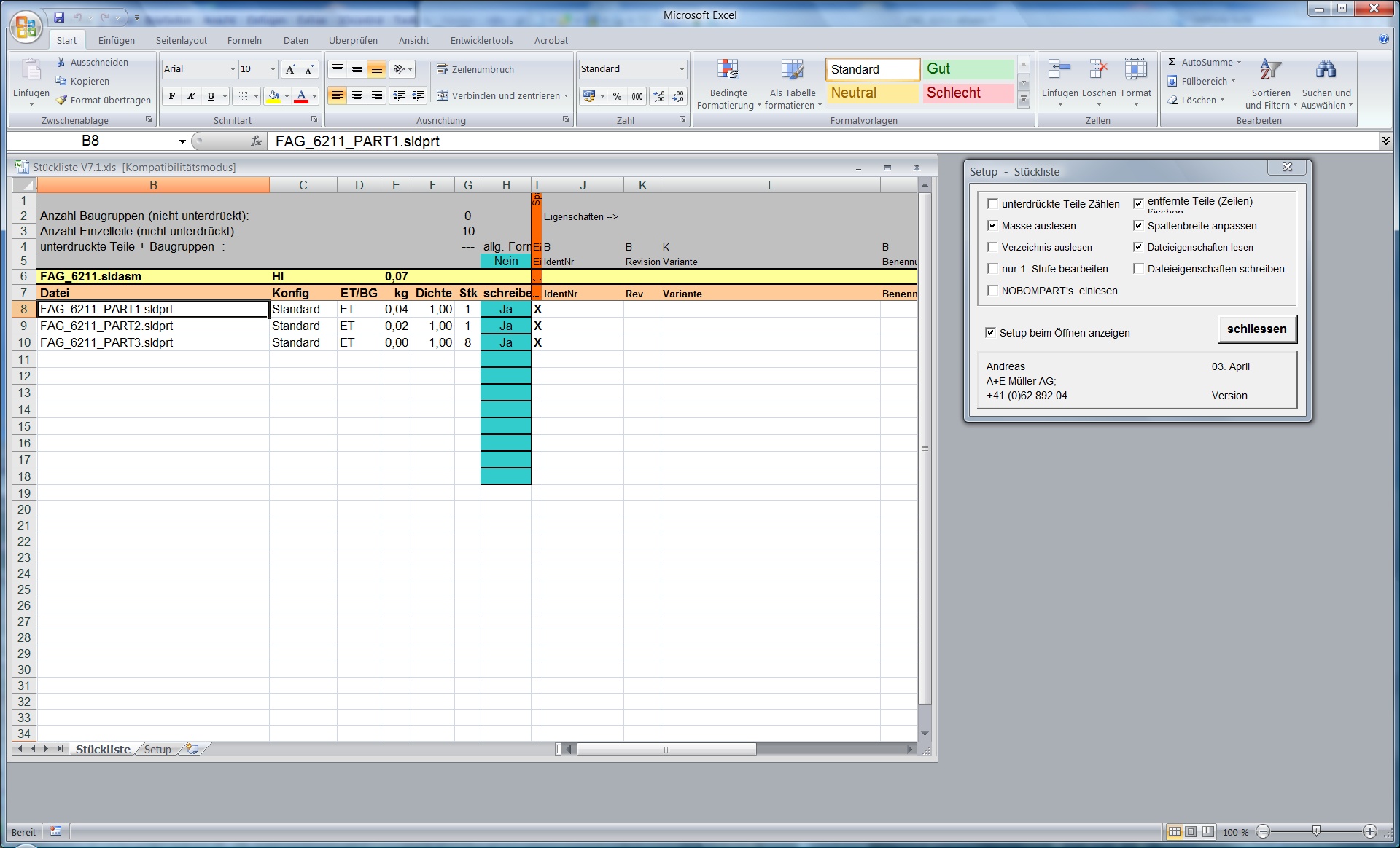 Hallo ad_man, suuuper! jetzt hat's geklappt! Das scheint "nuuuur" darin gelegen zu haben, dass ich beim Kontexmenü auf "T/ BG Eigeschaften auslesen" getippt habe. Das Zauberwort war jedoch: Kontexmenu und "Tabelle aktualisieren". Sicher musste ich noch vorher mit Alt+F11 bei den Extras vom VBA-Editor die Verweise, die von Dir auf SW2009 waren auf SW 2008 ändern, aber da stand auch "...2009 nicht vorhanden". Prima. Vielen Dank für deine Hartnäckigkeit. Der Erfolg lautet: "Das Stücklistesprogramm von Andreas Müller Version 7.1 läuft auf SW2008-SP5 und mit EXCEL 2007" (Falls die Version V8 doch noch laufen sollte ... melde ich's) Das ist der Beginn einer laaangen Freundchschaft. Vielen Dank auch an Allen. golipuc
