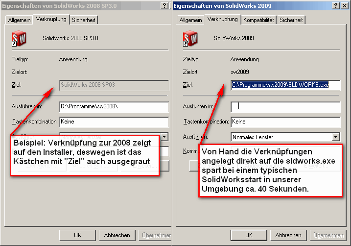 Hallo Michael, über die normale Desktopverknüpfung wird wie du schon beschrieben hast nicht SolidWorks direkt gestartet sondern praktisch der Installer. Der schaut nach, ob es nicht was zu aktualisieren gibt - sogar, wenn du in SolidWorks eingestellt hast, dass er nicht nach Aktualisierungen suchen soll. Ich persönlich halte das für eine hausgemachten Unsinn und hatte das auch gemeldet, allerdings ist SolidWorks da der Meinung, dass es als Hilfe und Service für den Anwender unabdingbar ist, da ja auch z.B. nach eDrawings Aktualisierungen geschaut werden muss (und da kann man es nicht ausschalten). Man erkennt das übrigens auch daran, dass in den Eigenschaften der Verknüpfung das "Ziel" ausgegraut ist, man muss erst relativ mühsam über die Registry gehen um herauszufinden, dass nicht etwa SolidWorks gestartet wird sondern der Installer. Wir machen das bei uns z.B. so, dass wir nach der Installation von SolidWorks aus dem Startmenu und vom Desktop alle verlinkten SolidWorks Buttons wegschmeißen und den durch die direkte Verknüpfung zu sldworks.exe im installierten Programmverzeichnis ersetzen. Das hat natürlich als Konsequenz, dass nicht nur die durchschnittliche Startzeit bei uns um 40 Sekunden beschleunigt wurde sondern auch nicht dauernd SolidWorks nach Hause telefoniert, nicht am rumquaken ist, dass es aber eine neuere Version von irgendwas gibt und meine Anwender nicht alle nervös werden, warum wir denn wohl selbst 2 Tage nach der neuen Version die immer noch nicht einsetzen. Also unterm Strich eigentlich nur Vorteile, so lange man (oder ein Poweruser/Admin) dann eben selbst ein bisschen auf die aktuellen Servicepacks achtet  Ciao, Stefan ------------------ Inoffizielle deutsche SolidWorks Hilfeseite http://solidworks.cad.de Stefans SolidWorks Blog Eine Antwort auf diesen Beitrag verfassen (mit Zitat/Zitat des Beitrags) IP |