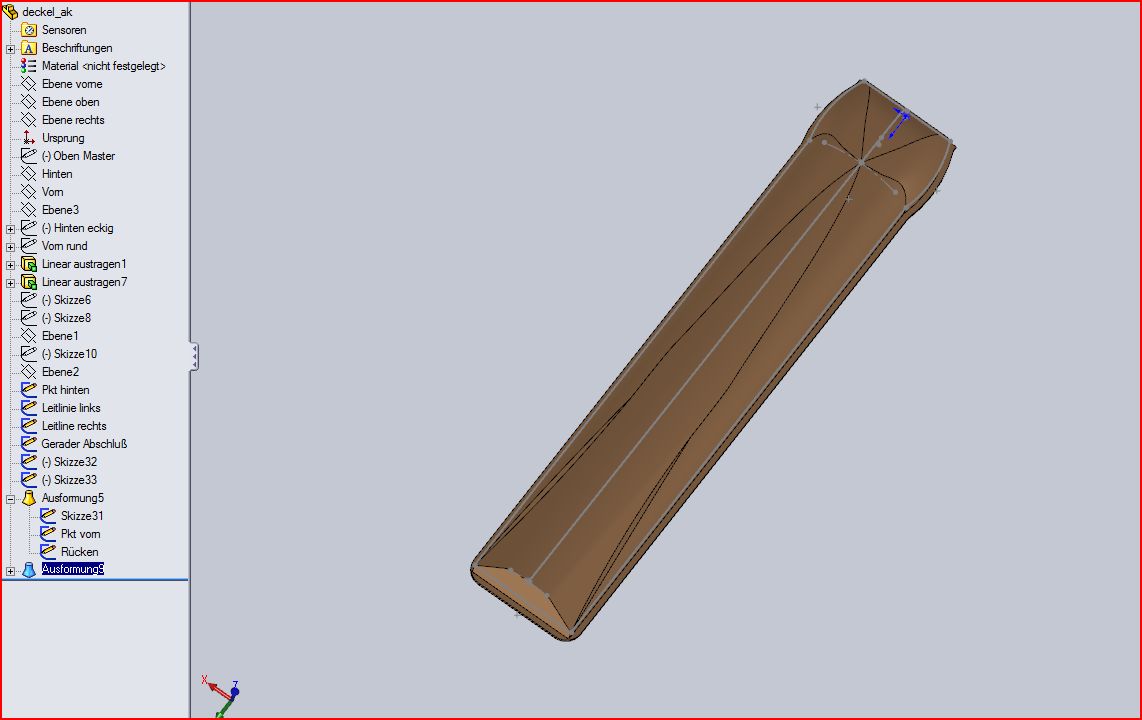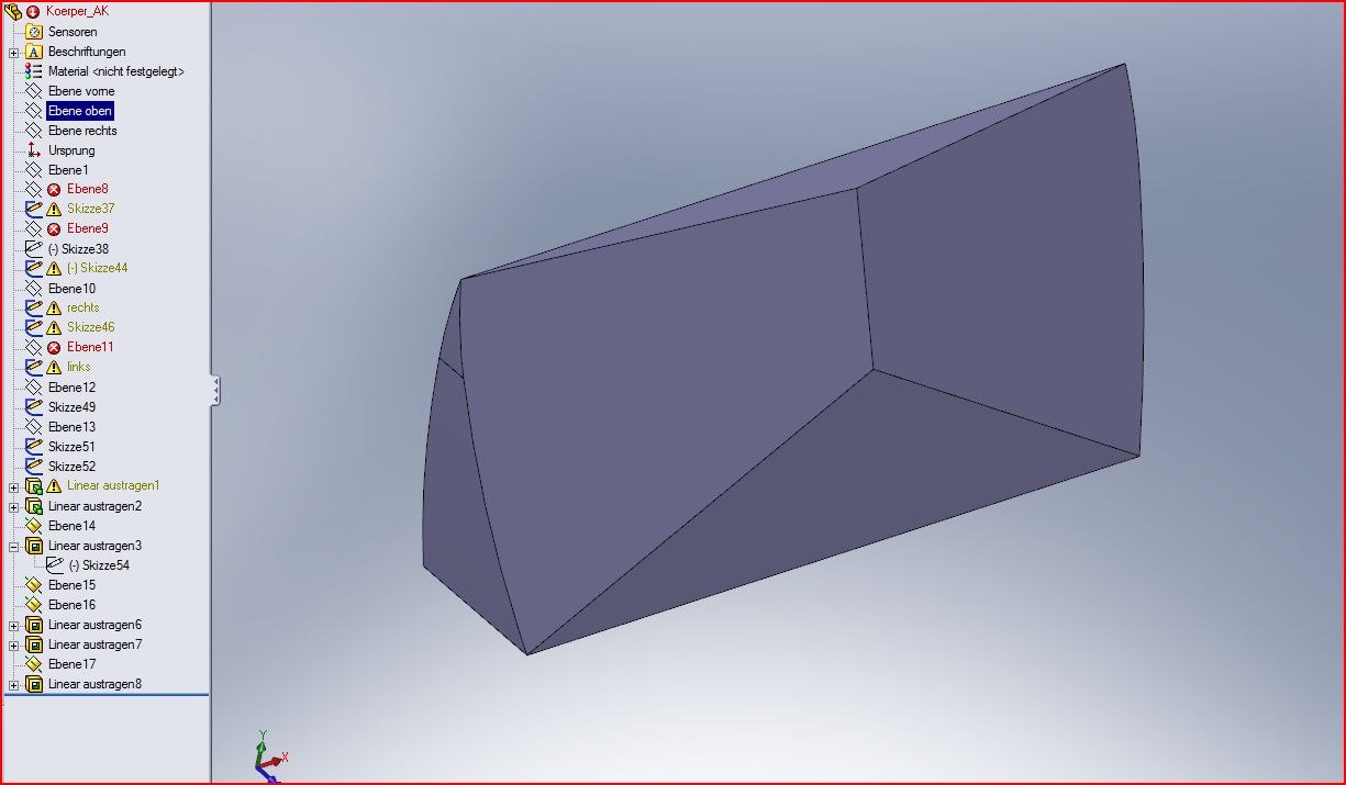 THx! GWS, Krümmel! Beide Lösungen verstanden! Mein Ansatz war eher der von GWS, nur habe ich die 3D-Skizzen Oberflächen mit dem falschen Werkzeug (ausgeformte Oberfläche statt ausgefüllte Oberfläche) versucht zu erstellen, somit war zumindest mein Denkansatz nicht ganz verkehrt