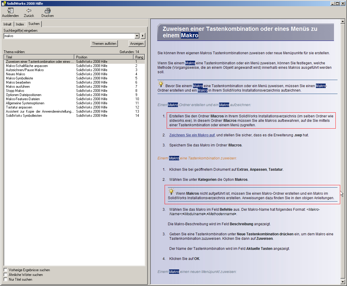 Hallo Iwona! In der SolidWorks-Hilfe findet man bei der Suche nach "Makro" ganz oben in der Liste einen Eintrag, der sich genau damit beschäftigt. Also, wenn man im SolidWorks Installationsverzeichnis einen Ordner "Macros" erstellt, dann erscheinen die dort befindlichen Makros in der Liste für die Tastaturzuordnungen. Jetzt sollte es doch aber klappen ------------------ Viele Grüße Uwe Mahner SolidWorks Support Techniker CSWP CSWST (Certified SolidWorks Support Technican) [Diese Nachricht wurde von grisu486 am 03. Jul. 2009 editiert.] Eine Antwort auf diesen Beitrag verfassen (mit Zitat/Zitat des Beitrags) IP |