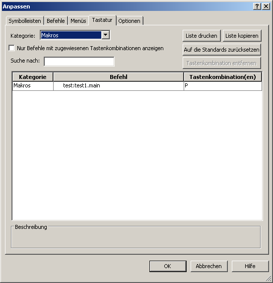 Hallo Milan, die Vorgehensweise ist mir bekannt. In der Liste ist die Belegung "P" jedoch nicht zu finden (es soll der Buchstabe "P" einzeln sein), daher kann ich sie dort nicht entfernen. Auch Zuordnung ist nicht möglich, da mein Macro nicht gelistet ist. Gruß ------------------ Iwona Eine Antwort auf diesen Beitrag verfassen (mit Zitat/Zitat des Beitrags) IP |